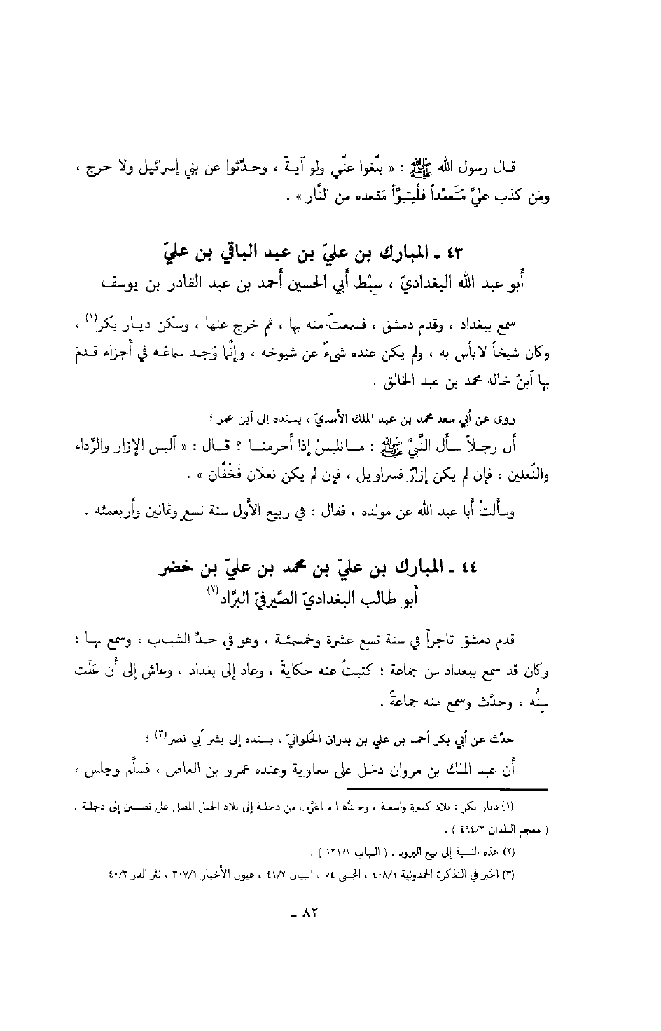 قال رسول الله صَلَّى اللهُ عَلَيْهِ وَسَلَّمَ: " بلغوا عني ولو آية، وحدثوا عن بني إسرائيل ولا حرج، ومن كذب علي متعمداً فليتبوأ مقعده من النار ".