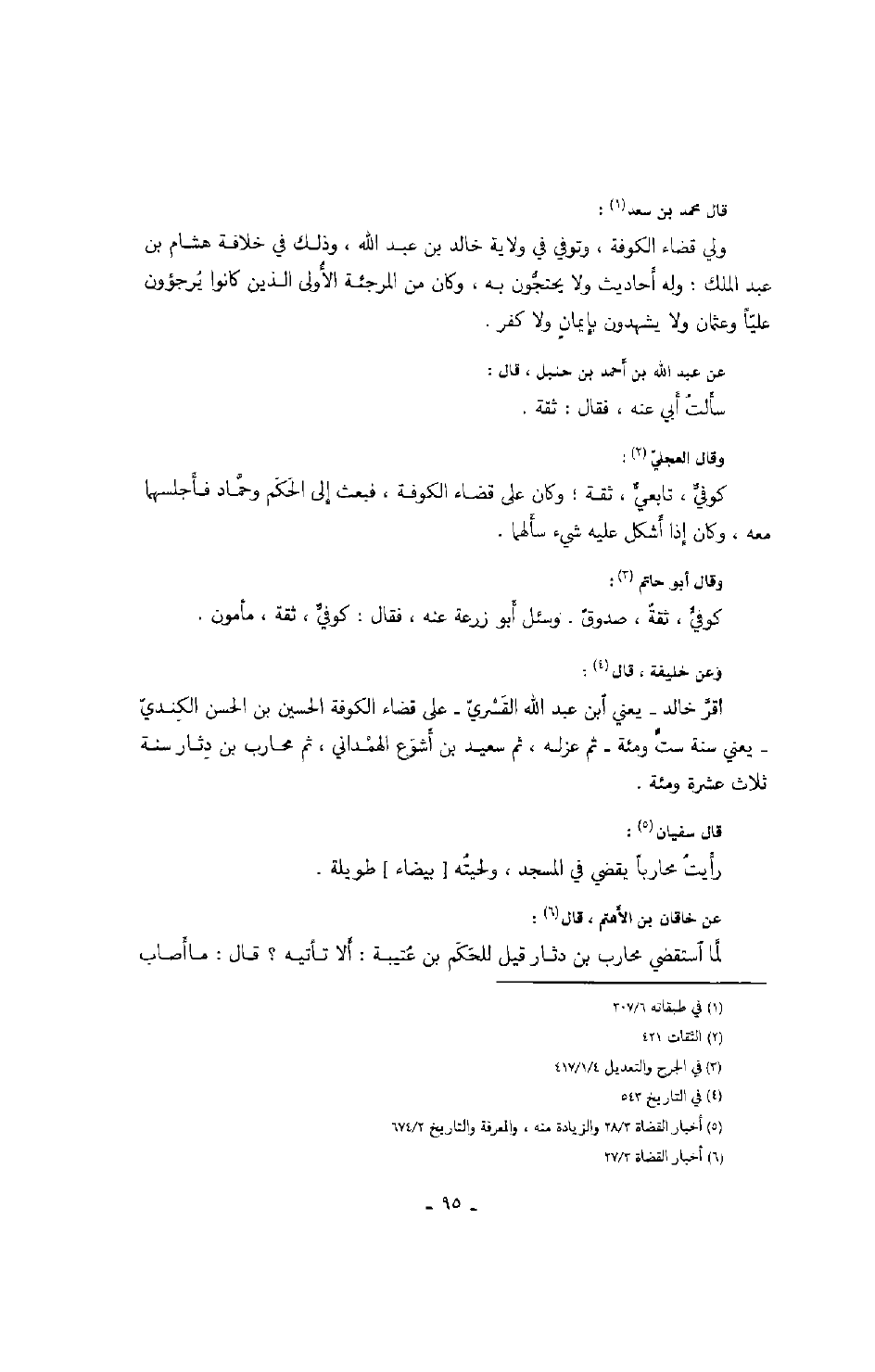 وقال العجلي: كوفي، تابعي، ثقة؛ وكان على قضاء الكوفة، فبعث إلى الحكم وحماد فأجلسهما معه، وكان إذا أشكل عليه شيء سألهما.