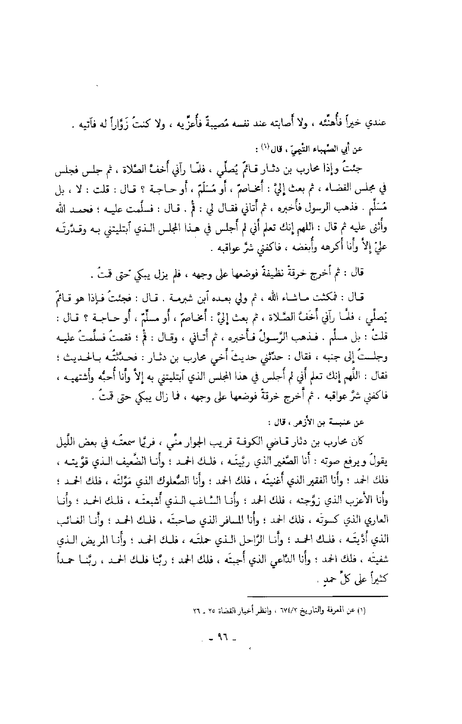عن عنبسة بن الأزهر، قال: كان محارب بن دثار قاضي الكوفة قريب الجوار مني، فربما سمعته في بعض الليل يقول ويرفع صوته: أنا الصغير الذي ربيته، فلك الحمد؛ وأنا الضعيف الذي قويته، فلك الحمد؛ وأنا الفقير الذي أغنيته، فلك الحمد؛ وأنا الصعلوك الذي مولته، فلك الحمد؛ وأنا الأعزب الذي زوجته، فلك الحمد؛ وأنا الساغب الذي أشبعته، فلك الحمد؛ وأنا العاري الذي كسوته، فلك الحمد؛ وأنا المسافر الذي صاحبته، فلك الحمد؛ وأنا الغائب الذي أديته، فلك الحمد؛ وأنا الراحل الذي حملته، فلك الحمد؛ وأنا المريض الذي شفيته، فلك الحمد؛ وأنا الداعي الذي أجبته، فلك الحمد؛ ربنا فلك الحمد، ربنا حمداً كثيراً على كل حمد.