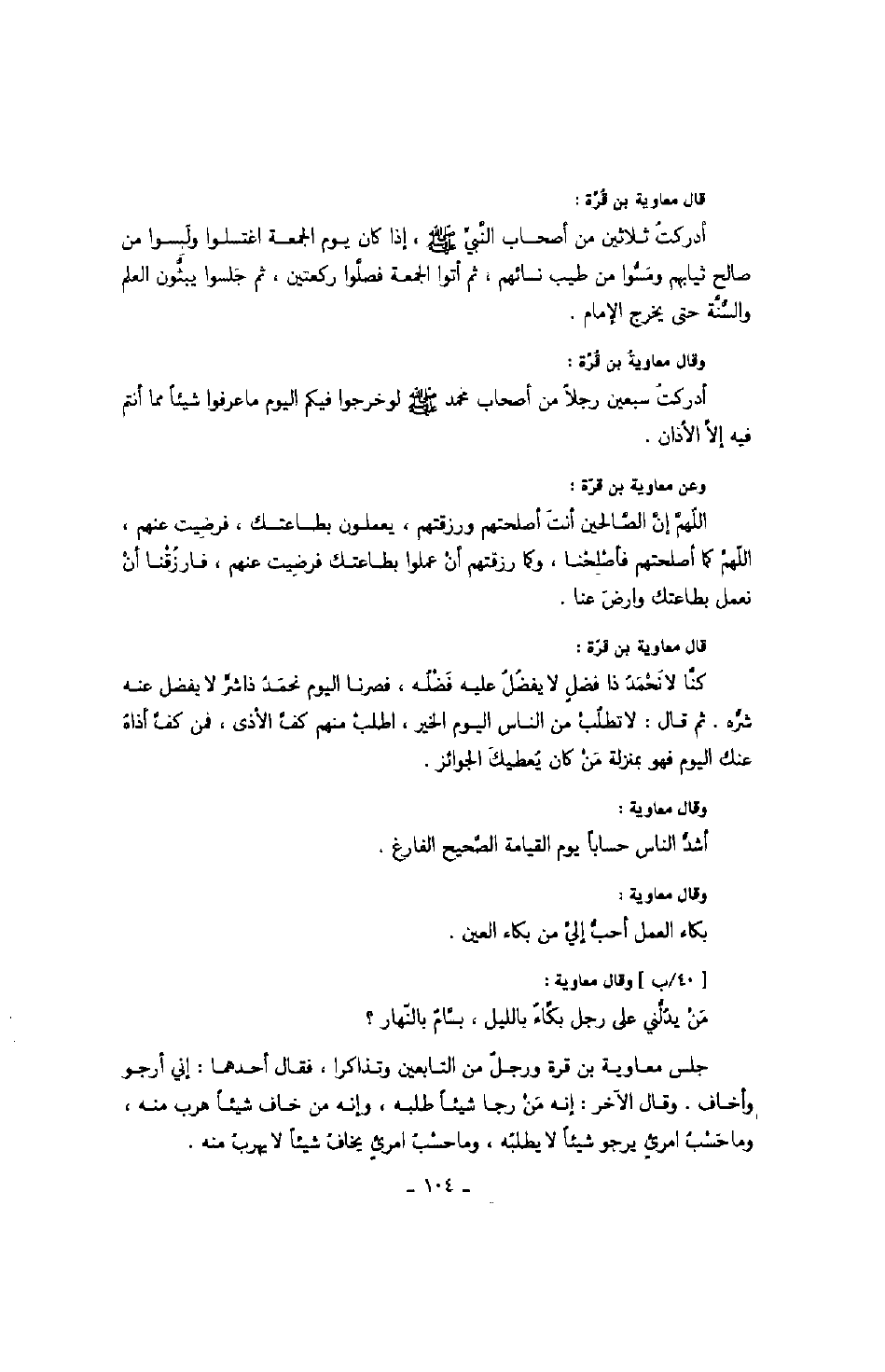 وقال معاوية بن قرة: أدركت سبعين رجلاً من أصحاب محمد صَلَّى اللهُ عَلَيْهِ وَسَلَّمَ لو خرجوا فيكم اليوم ما عرفوا شيئاً مما أنتم فيه إلا الأذان.