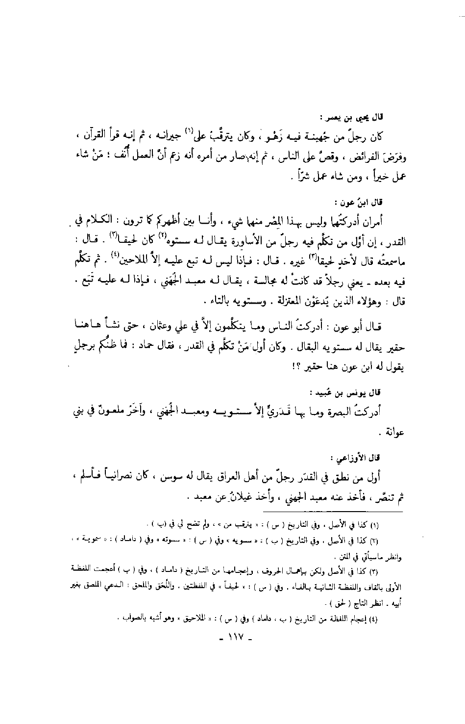 قال ابن عون: أمران أدركتهما وليس بهذا المصر منهما شيء، وأنا بين أظهركم كما ترون: الكلام في القدر، إن أول من تكلم فيه رجل من الأساورة يقال له سستوه كان لحيقا. قال: ما سمعته قال لأحد لحيقا غيره. قال: فإذا ليس له تبع عليه إلا الملاحين. ثم تكلم فيه بعده - يعني رجلاً قد كانت له مجالسة، يقال له معبد الجهني، فإذا له عليه تبع. قال: وهؤلاء الذين يدعون المعتزلة. وسستويه بالتاء.
