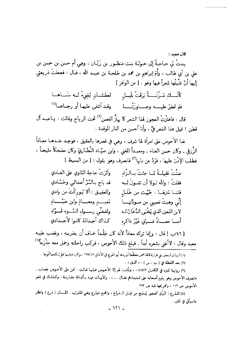 غدا الأحوص على امرأة لها شرف، وهي في قصرها بالعقيق، فوجد عندها معاذاً الزرقي - وكان حسن الغناء - ومعبداً المغني، وابن صياد النجاري وكان مضحكاً مليحاً، فطلب إذن عليها، فرد عن بابها فانصرف وهو يقول: من البسيط