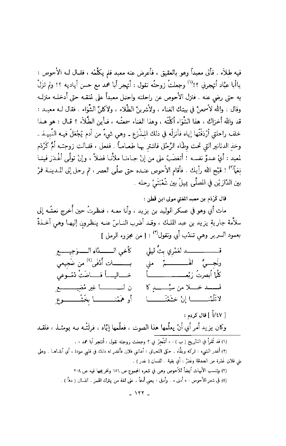 فيه طلاء. فأتى معبداً وهو بالعقيق، فأعرض عنه معبد فلم يكلمه، فقال له الأحوص: يا أبا عباد أتهجرني؟! وجعلت زوجته تقول: أتهجر أبا محمد مع حسن أياديه؟! ولم تزل به حتى رضي عنه. فنزل الأحوص عن راحلته واحتمل معبداً على عنقه حتى أدخله منزله وقال: والله لأسمعن في بيتك الغناء، ولأشربن الطلاء، ولآكلن الشواء. فقال له معبد: قد والله أخزاك، هذا الشواء أكلته، وهذا الغناء سمعته، فأين الطلاء؟ قال: هو هذا خلف راحلتي أردفتها إياه فأنزله في ذلك المذرع - وهي شيء من أدم يجعل فيه النبيذ - وخذ الدنانير التي تحت وطاء الرحل فاشتر بها طعاماً. ففعل، فقالت زوجته أم كردم لمعبد: أي عدو نفسه! أتغضب على من إن جاءنا ملأنا فضلاً، وإن تولى أغدر فينا نعماً! قبح الله رأيك. فأقام الأحوص عنده حتى صلى العصر، ثم رحل إلى المدينة فمر بين الدارين في المصلى يميل بين شعبتي رحله.