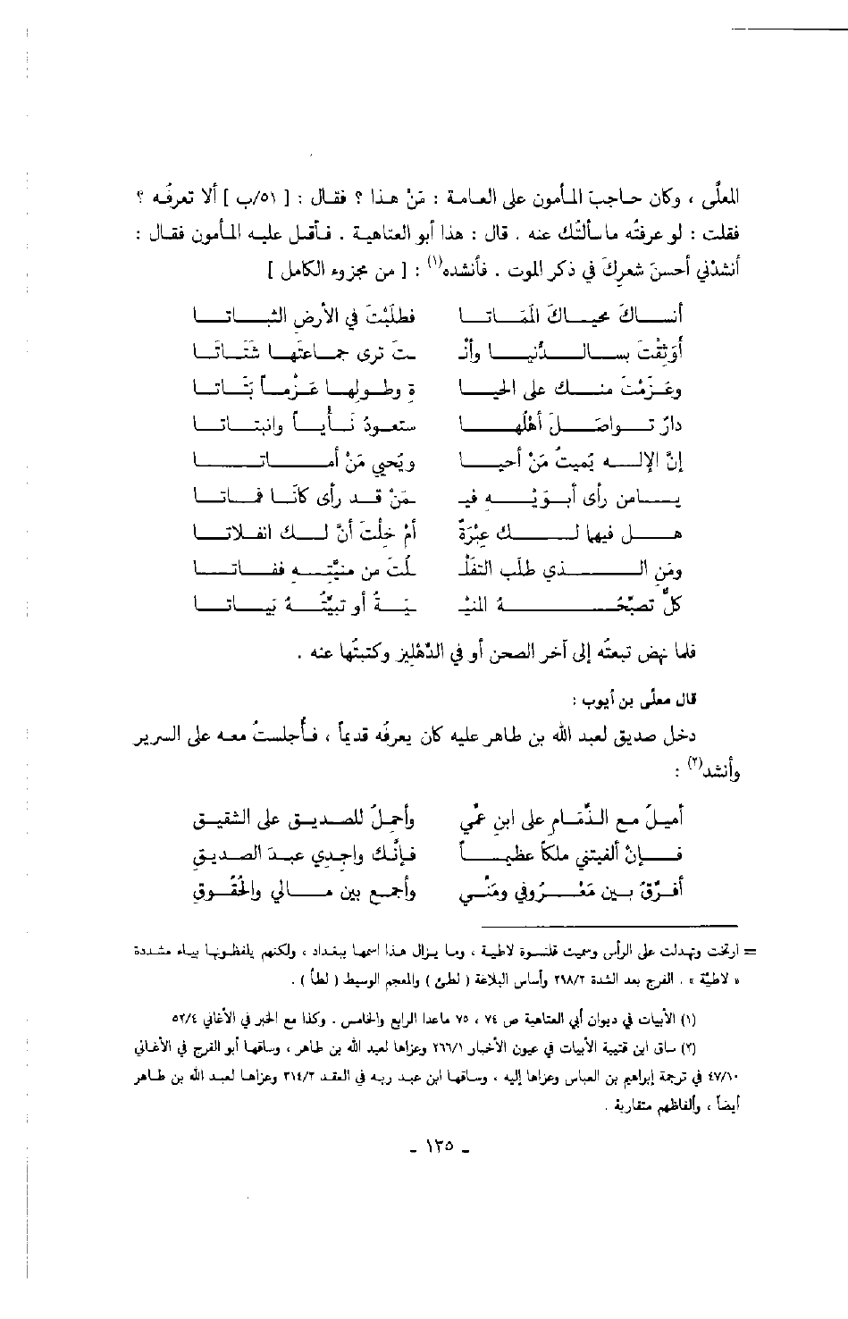المعلى، وكان حاجب المأمون على العامة: من هذا؟ فقال: ألا تعرفه؟ فقلت: لو عرفته ما سألتك عنه. قال: هذا أبو العتاهية. فأقبل عليه المأمون فقال: أنشدني أحسن شعرك في ذكر الموت. فأنشده: من مجزوء الكامل