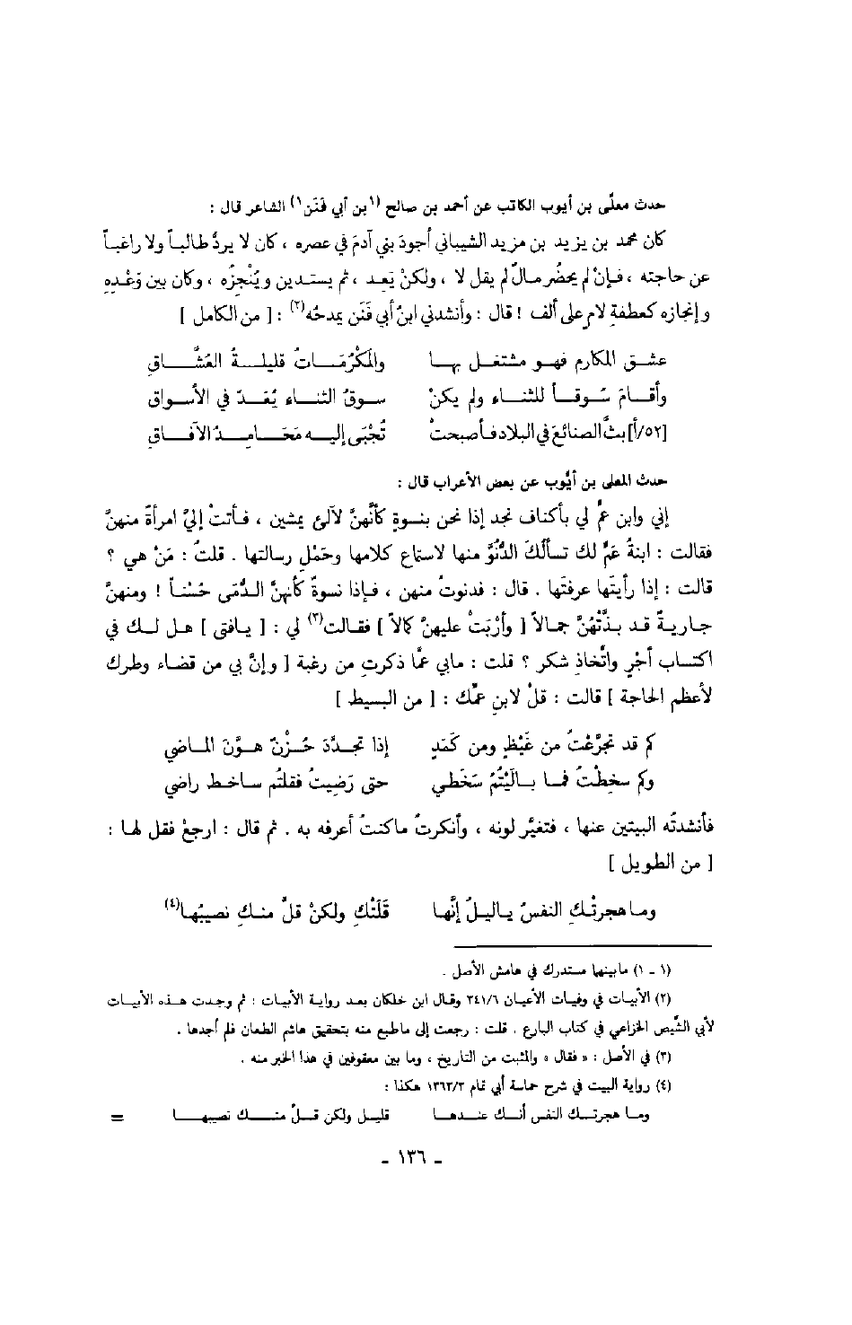 حدث المعلى بن أيوب عن بعض الأعراب قال: إني وابن عم لي بأكناف نجد إذا نحن بنسوة كأنهن لآلئ يمشين، فأتت إلي امرأة منهن فقالت: ابنة عم لك تسألك الدنو منها لاستماع كلامها وحمل رسالتها. قلت: من هي؟ قالت: إذا رأيتها عرفتها. قال: فدنوت منهن، فإذا نسوة كأنهن الدمى حسناً! ومنهن جارية قد بذتهن جمالاً وأربت عليهن كمالاً فقالت لي: يا فتى هل لك في اكتساب أجر واتخاذ شكر؟ قلت: ما بي عما ذكرت من رغبة وإن بي من قضاء وطرك لأعظم الحاجة قالت: قل لابن عمك: من البسيط