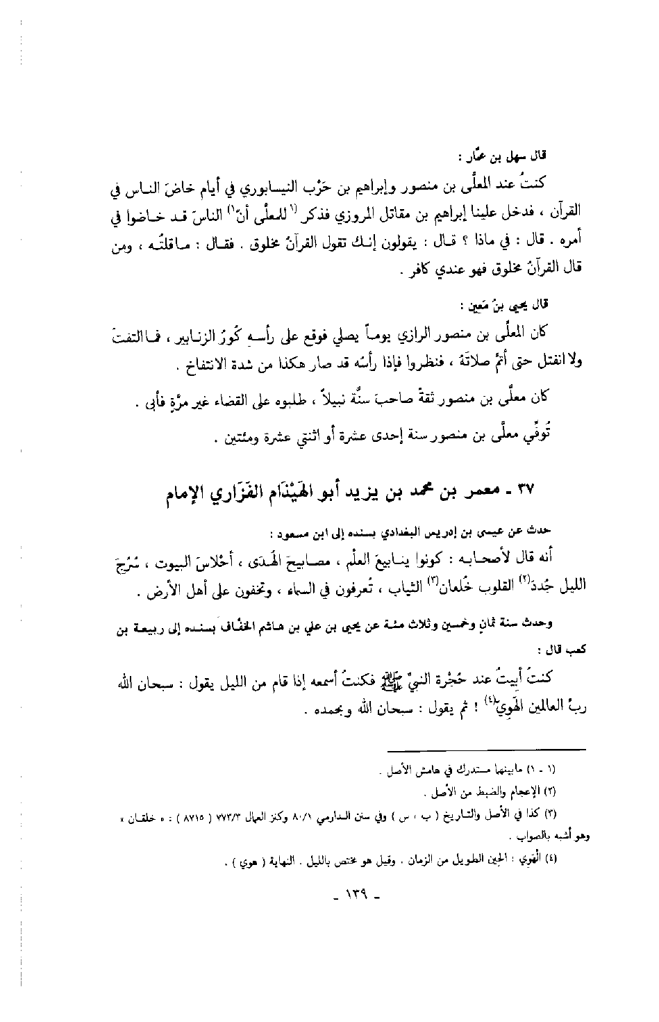 قال يحيى بن معين: كان المعلى بن منصور الرازي يوماً يصلي فوقع على رأسه كور الزنانير، فما التفت ولا انفتل حتى أتم صلاته، فنظروا فإذا رأسه قد صار هكذا من شدة الانتفاخ.