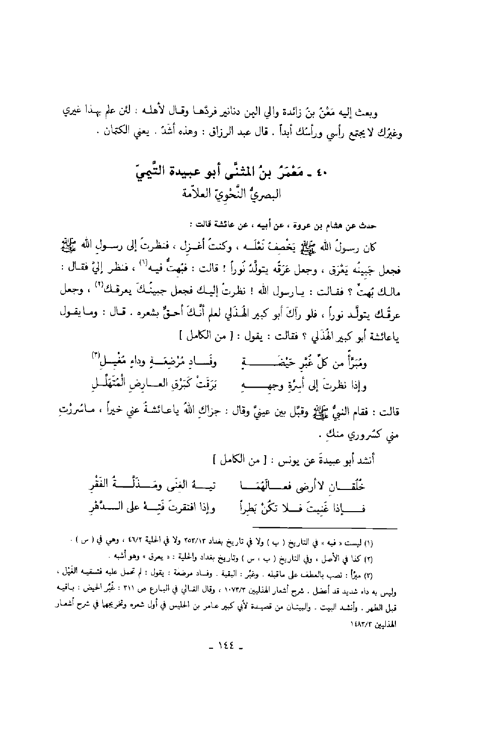 البصري النحوي العلامة حدث عن هشام بن عروة، عن أبيه، عن عائشة قالت: كان رسول الله صَلَّى اللهُ عَلَيْهِ وَسَلَّمَ يخصف نعله، وكنت أغزل، فنظرت إلى رسول الله صَلَّى اللهُ عَلَيْهِ وَسَلَّمَ فجعل جبينه يعرق، وجعل عرقه يتولد نوراً! قالت: فبهت فيه، فنظر إلي فقال: مالك بهت؟ فقالت: يا رسول الله! نظرت إليك فجعل جبينك يعرقك، وجعل عرقك يتولد نوراً، فلو رآك أبو كبير الهذلي لعلم أنك أحق بشعره. قال: وما يقول يا عائشة أبو كبير الهذلي؟ فقال: يقول: من الكامل