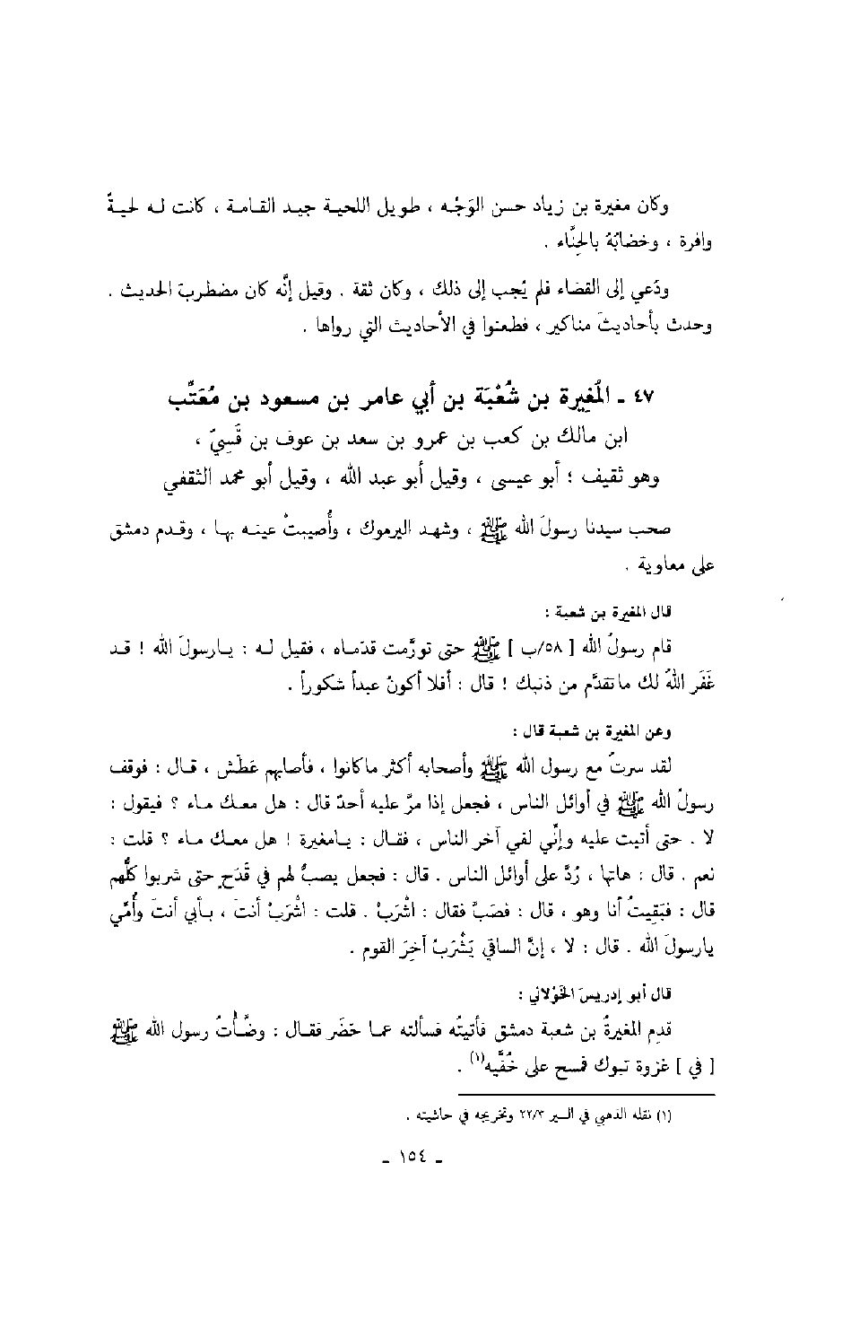 قال أبو إدريس الخولاني: قدم المغيرة بن شعبة دمشق فأتيته فسألته عما حضر فقال: وضأت رسول الله صَلَّى اللهُ عَلَيْهِ وَسَلَّمَ في غزوة تبوك فمسح على خفيه.