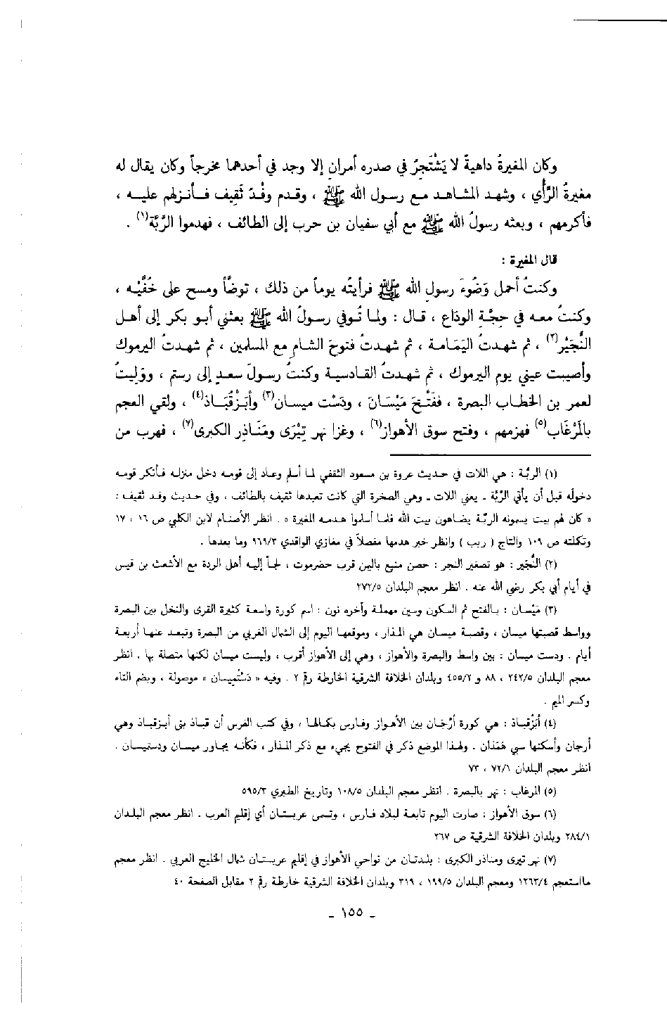 قال المغيرة: وكنت أحمل وضوء رسول الله صَلَّى اللهُ عَلَيْهِ وَسَلَّمَ فرأيته يوماً من ذلك، توضأ ومسح على خفيه، وكنت معه في حجة الوداع، قال: ولما توفي رسول الله صَلَّى اللهُ عَلَيْهِ وَسَلَّمَ بعثني أبو بكر إلى أهل النجير، ثم شهدت اليمامة، ثم شهدت فتوح الشام مع المسلمين، ثم شهدت اليرموك وأصيبت عيني يوم اليرموك، ثم شهدت القادسية وكنت رسول سعد إلى رستم، ووليت لعمر بن الخطاب البصرة، ففتح ميسان، ودست ميسان وأبزقباذ، ولقي العجم بالمرغاب فهزمهم، وفتح سوق الأهواز، وغزا نهر تيرى ومناذر الكبرى، فهرب من