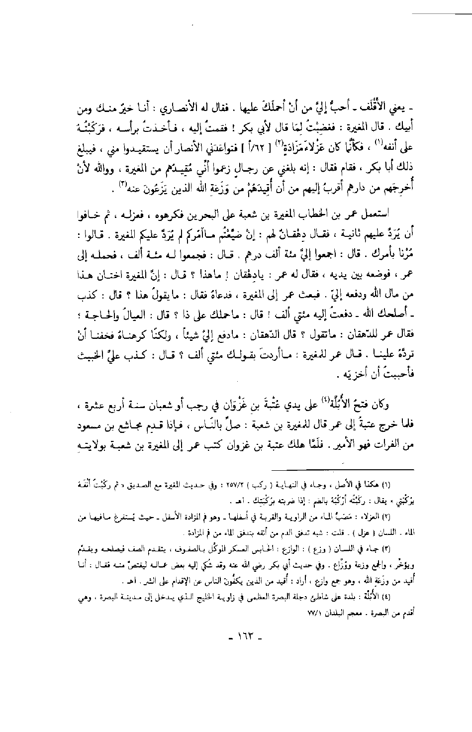وكان فتح الأبلة على يدي عتبة بن غزوان في رجب أو شعبان سنة أربع عشرة، فلما خرج عتبة إلى عمر قال للمغيرة بن شعبة: صل بالناس، فإذا قدم مجاشع ين مسعود من الفرات فهو الأمير. فلما هلك عتبة بن غزوان كتب عمر إلى المغيرة بن شعبة بولايته