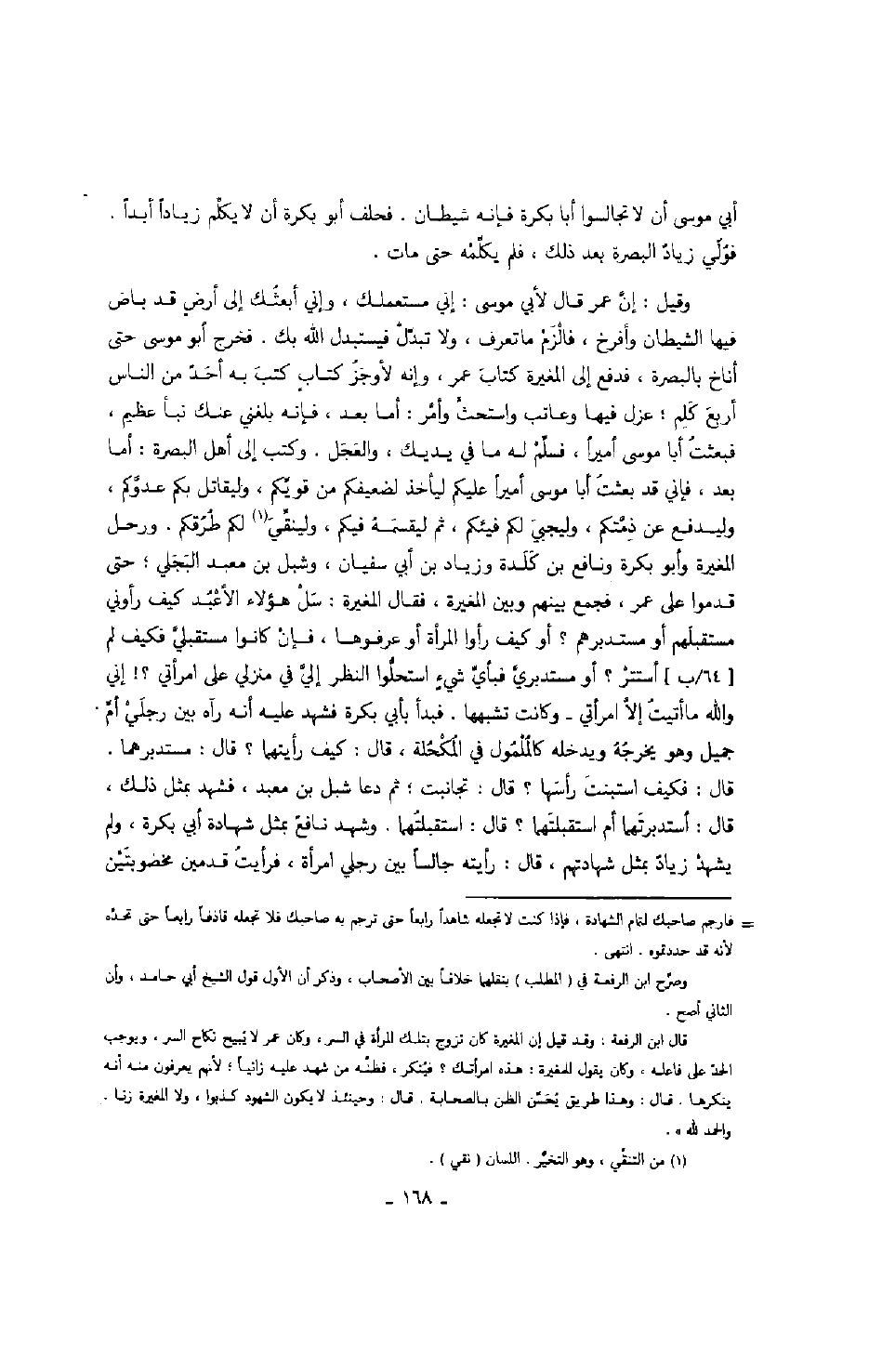 وقيل: إن عمر قال لأبي موسى: إني مستعملك، وإني أبعثك إلى أرض قد باض فيها الشيطان وأفرخ، فالزم ما تعرف، ولا تبدل فيستبدل الله بك. فخرج أبو موسى حتى أناخ بالبصرة، فدفع إلى المغيرة كتاب عمر، وإنه لأوجز كتاب كتب به أحد من الناس أربع كلم؛ عزل فيها وعاتب واستحث وأمر: أما بعد، فإنه بلغني عنك نبأ عظيم، فبعثت أبا موسى أميراً، فسلم له ما في يديك، والعجل. وكتب إلى أهل البصرة: أما بعد، فإني قد بعثت أبا موسى أميراً عليكم ليأخذ لضعيفكم من قويكم، وليقاتل بكم عدوكم، وليدفع عن ذمتكم، وليجبي لكم فيئكم، ثم ليقسمه فيكم، ولينقي لكم طرفكم. ورحل المغيرة وأبو بكرة ونافع بن كلدة وزياد بن أبي سفيان، وشبل بن معبد البجلي؛ حتى قدموا على عمر، فجمع بينهم وبين المغيرة، فقال المغيرة: سل هؤلاء الأعبد كيف رأوني مستقبلهم أو مستدبرهم؟ أو كيف رأوا المرأة أو عرفوها، فإن كانوا مستقبلي فكيف لم أستتر؟ أو مستدبري فبأي شيء استحلوا النظر إلي في منزلي على امرأتي؟! إني والله ما أتيت إلا امرأتي - وكانت تشبهها. فبدأ بأبي بكرة فشهد عليه أنه رآه بين رجلي أم جميل وهو يخرجه ويدخله كالملمول في المكحلة، قال: كيف رأيتهما؟ قال: مستدبرهما. قال: فكيف استبنت رأسها؟ قال: تجانبت؛ ثم دعا شبل بن معبد، فشهد بمثل ذلك، قال: أستدبرتهما أم استقبلتهما؟ قال: استقبلتهما. وشهد نافع بمثل شهادة أبي بكرة، ولم يشهد زياد بمثل شهادتهم، قال: رأيته جالساً بين رجلي امرأة، فرأيت قدمين مخضوبتين