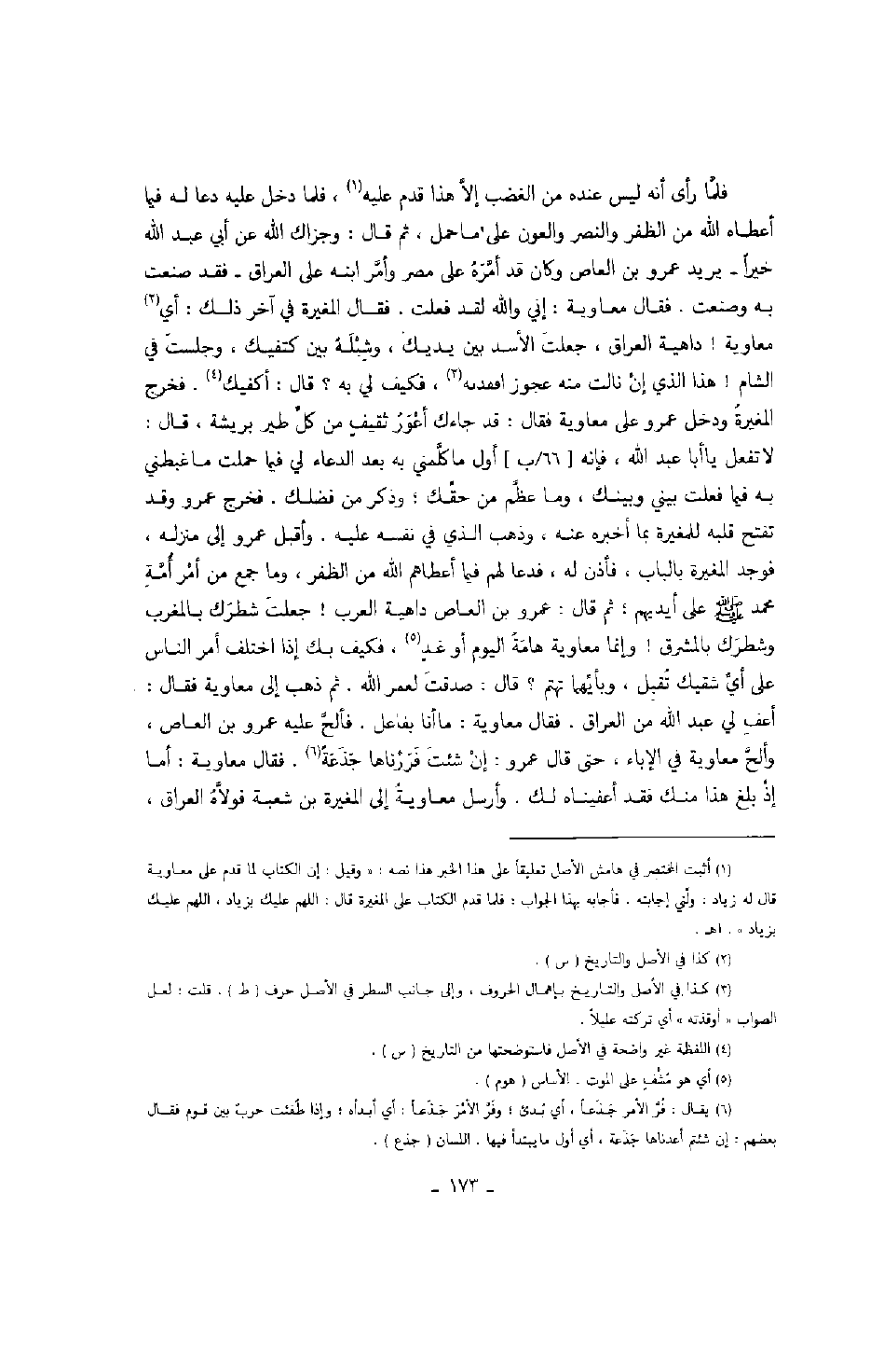 فلما رأى أنه ليس عنده من الغضب إلا هذا قدم عليه، فلما دخل عليه دعا له فيما أعطاه الله من الظفر والنصر والعون على ما حمل، ثم قال: وجزاك الله عن أبي عبد الله خيراً - يريد عمرو بن العاص وكان قد أمره على مصر وأمر ابنه على العراق - فقد صنعت به وصنعت. فقال معاوية: إني والله لقد فعلت. فقال المغيرة في آخر ذلك: أي معاوية! داهية العراق، جعلت الأسد بين يديك، وشبله بين كتفيك، وجلست في الشام! هذا الذي إن نالت منه عجوز افقدته، فكيف لي به؟ قال: أكفيك. فخرج المغيرة ودخل عمرو على معاوية فقال: قد جاءك أعور ثقيف من كل طير بريشة، قال: لا تفعل يا أبا عبد الله، فإنه أول ما كلمني به بعد الدعاء لي فيما حملت ما غبطني به فيما فعلت بيني وبينك، وما عظم من حقك؛ وذكر من فضلك. فخرج عمرو وقد تفتح قلبه للمغيرة بما أخبره عنه، وذهب الذي في نفسه عليه. وأقبل عمرو إلى منزله، فوجد المغيرة بالباب، فأذن له، فدعا لهم فيما أعطاهم الله من الظفر، وما جمع من أمر أمة محمد صَلَّى اللهُ عَلَيْهِ وَسَلَّمَ على أيديهم؛ ثم قال: عمرو بن العاص داهية العرب! جعلت شطرك بالمغرب وشطرك بالمشرق! وإنما معاوية هامة اليوم أو غد، فكيف بك إذا اختلف أمر الناس على أي سقيك تقبل، وبأيهما تهتم؟ قال: صدقت لعمر الله. ثم ذهب إلى معاوية فقال: أعف لي عبد الله من العراق. فقال معاوية: ما أنا بفاعل. فألح عليه عمرو بن العاص، وألح معاوية في الإباء، حتى قال عمرو: إن شئت فررناها جذعة. فقال معاوية: أما إذ بلغ هذا منك فقد أعفيناه لك. وأرسل معاوية إلى المغيرة بن شعبة فولاه العراق،