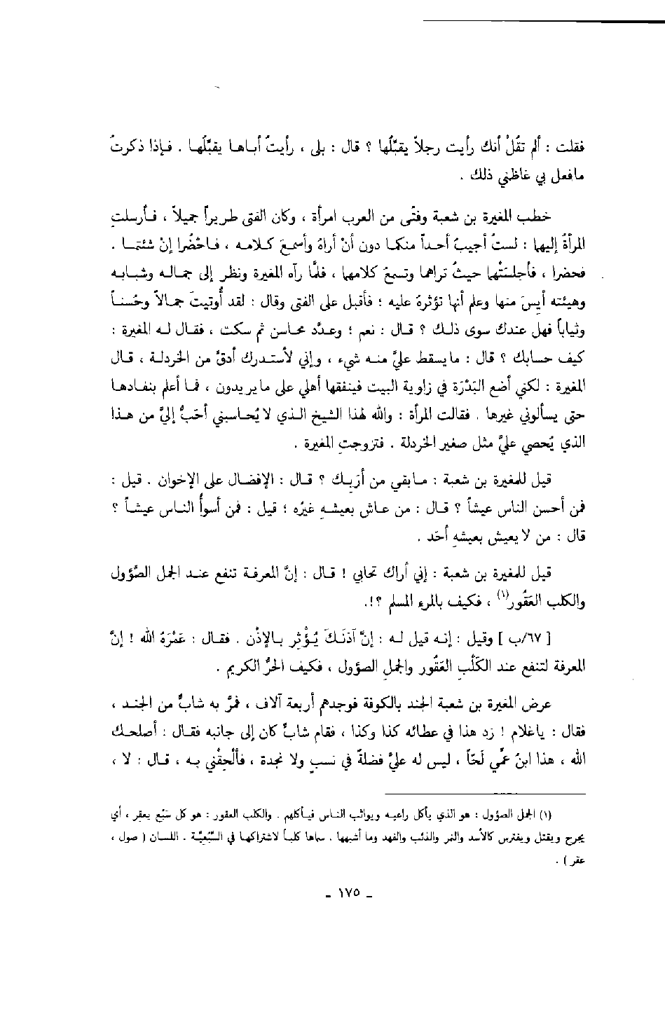 خطب المغيرة بن شعبة وفتى من العرب امرأة، وكان الفتى طريراً جميلاً، فأرسلت المرأة إليهما: لست أجيب أحداً منكما دون أن أراه وأسمع كلامه، فاحضرا إن شئتما. فحضرا، فأجلستهما حيث تراهما وتسمع كلامهما، فلما رآه المغيرة ونظر إلى جماله وشبابه وهيئته أيس منها وعلم أنها تؤثره عليه؛ فأقبل على الفتى وقال: لقد أوتيت جمالاً وحسناً وثياباً فهل عندك سوى ذلك؟ قال: نعم؛ وعدد محاسن ثم سكت، فقال له المغيرة: كيف حسابك؟ قال: ما يسقط علي منه شيء، وإني لأستدرك أدق من الخردلة، قال المغيرة: لكني أضع البدرة في زواية البيت فينفقها أهلي على ما يريدون، فما أعلم بنفادها حتى يسألوني غيرها. فقالت المرأة: والله لهذا الشيخ الذي لا يحاسبني أحب إلي من هذا الذي يحصي علي مثل صغير الخردلة. فتزوجت المغيرة.