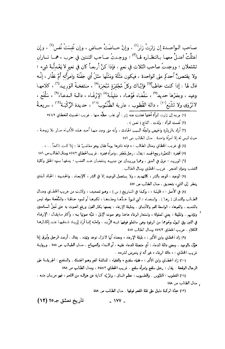 صاحب الواحدة إن زارت زار، وإن حاضت حاض، وإن نفست نفس، وإن اعتلت اعتل معها بانتظاره لها؛ ووجدت صاحب الثنتين في حرب، هما ناران تشتعلان؛ ووجدت صاحب الثلاث في نعم، فإذا كن أربعاً كان في نعيم لا يعدله شيء؛ ولا يقتصرن أحدكم على الواحدة، فيكون مثله ومثلها مثل أبي جفنة وامرأته أم عقار، إنه قال لها: إذا كنت خاطباً فإياك وكل مجفرة مبخرة، منتفخة الوريد، كلامها وعيد، وبصرها حديد، سفعاء فوهاء، مليلة الإرغاء، دائمة الدعاء، سلفع، لا تروى ولا تشبع، دائمة القطوب، عارية الظنبوب، حديدة الركبة، سريعة