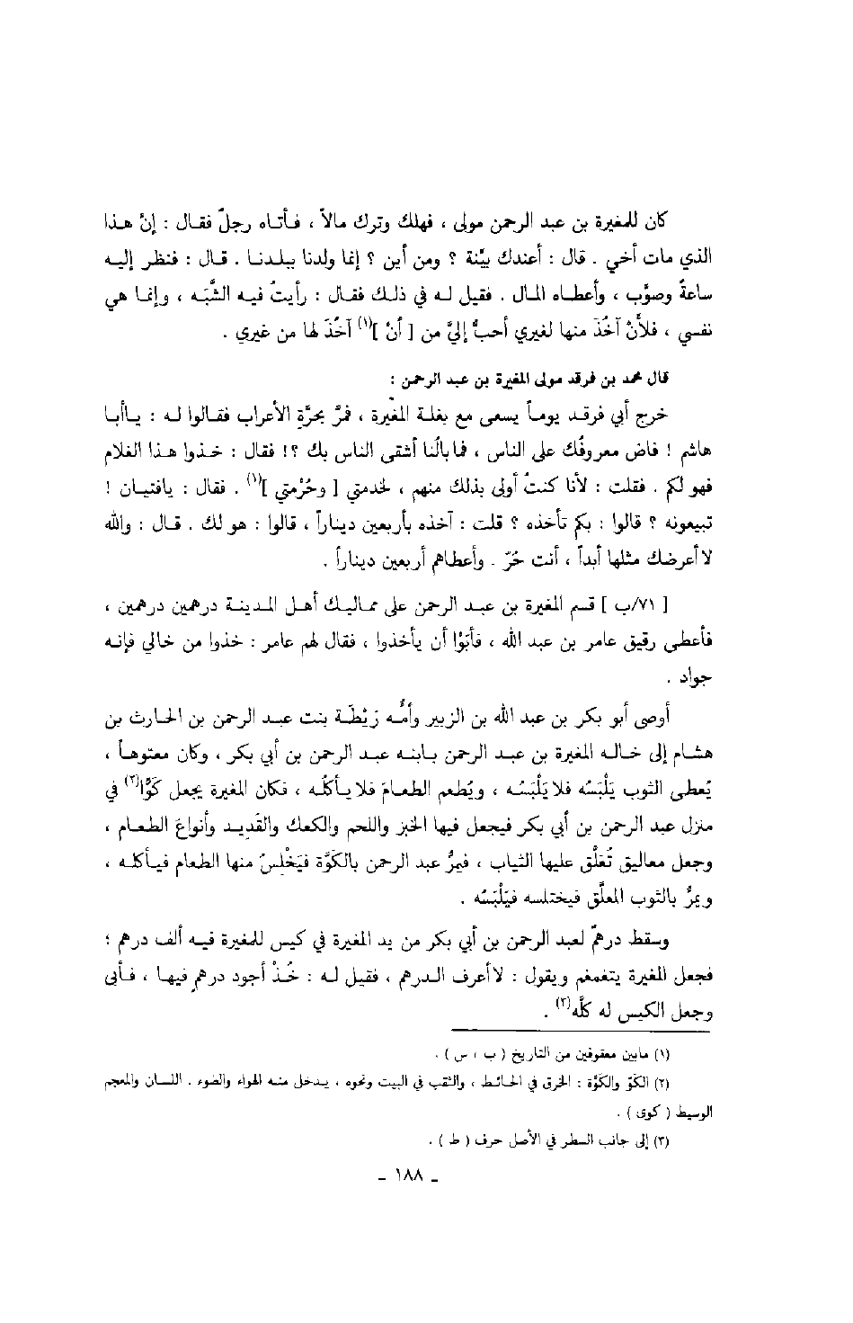 كان للمغيرة بن عبد الرحمن مولى، فهلك وترك مالاً، فأتاه رجل فقال: إن هذا الذي مات أخي. قال: أعندك بينة؟ ومن أين؟ إنما ولدنا ببلدنا. قال: فنظر إليه ساعة وصوب، وأعطاه المال. فقيل له في ذلك فقال: رأيت فيه الشبه، وإنما هي نفسي، فلأن آخذ منها لغيري أحب إلي من أن آخذ لها من غيري.