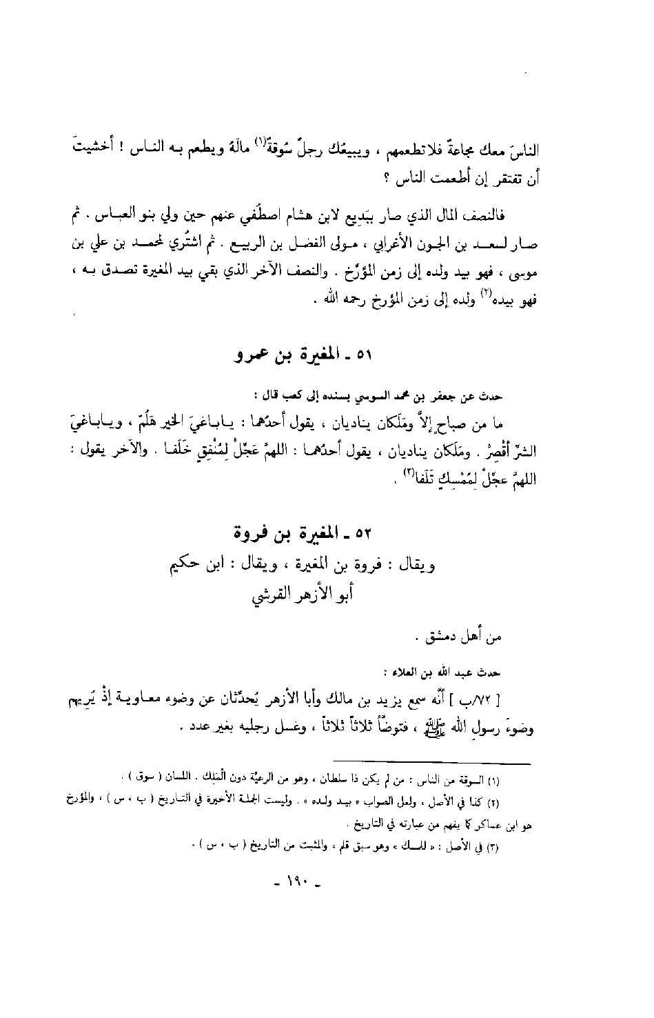 الناس معك مجاعة فلا تطعمهم، ويبيعك رجل سوقة ماله ويطعم به الناس! أخشيت أن تفتقر إن أطعمت الناس؟ فالنصف المال الذي صار ببديع لابن هشام اصطفي عنهم حين ولي بنو العباس. ثم صار لسعد بن الجون الأغرابي، مولى الفضل بن الربيع. ثم اشتري لمحمد بن علي بن موسى، فهو بيد ولده إلى زمن المؤرخ. والنصف الآخر الذي بقي بيد المغيرة تصدق به، فهو بيده ولده إلى زمن المؤرخ رحمه الله.