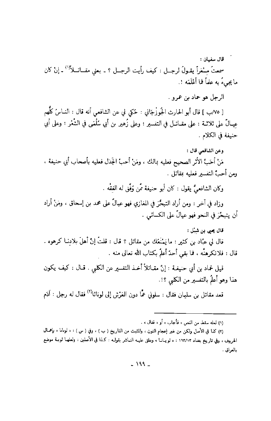 قال سفيان: سمعت مسعراً يقول لرجل: كيف رأيت الرجل؟ يعني مقاتلاً إن كان ما يجئ به علماً فما أعلمه!.