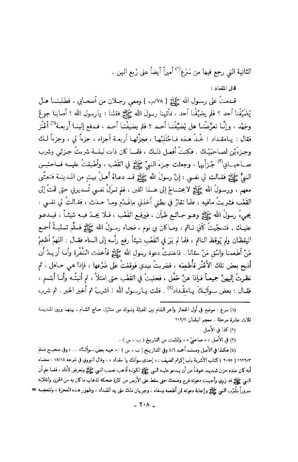 قدمت على رسول الله صَلَّى اللهُ عَلَيْهِ وَسَلَّمَ ومعي رجلان من أصحابي، فطلبنا هل يضيفنا أحد؟ فلم يضيفنا أحد؟ فلم يضيفنا أحد، فدفع إلينا أربعة أعنز فقال: يا مقداد! خذ هذه فاحتلبها، فجزئها أربعة أجزاء، جزءاً لي، وجزءاً لك وجزءين لصاحبيك. فكنت أفعل ذلك، فلما كان ذلك ليلة شربت جزئي وشرب صاحباي جزأيهما، وجعلت جزء النبي صَلَّى اللهُ عَلَيْهِ وَسَلَّمَ في العقب، وأطبقت عليه فاحتبس النبي صَلَّى اللهُ عَلَيْهِ وَسَلَّمَ فقالت لي نفسي: إن رسول الله صَلَّى اللهُ عَلَيْهِ وَسَلَّمَ قد دعاه أهل بيت من المدينة فتعشى معهم، ورسول الله صَلَّى اللهُ عَلَيْهِ وَسَلَّمَ لا يحتاج إلى هذا اللبن، فلم تزل نفسي تدبرني حتى قمت إلي القعب فشربت ما فيه، فلما تقار في بطني أخذني ما قدم وما حدث، فقالت لي نفسي: يجئ رسول الله صَلَّى اللهُ عَلَيْهِ وَسَلَّمَ وهو جائع ظمآن، فيرفع القعب، فلا يجد فيه شيئاً، فيدعو عليك. فتجيت كأني نائم، وما كان بي نوم، فجاء رسول الله صَلَّى اللهُ عَلَيْهِ وَسَلَّمَ فسلم تسليمه أسمع اليقظان ولم يوقظ النائم، فلما لم ير في القعب شيئاً رفع رأسه إلى السماء فقال: اللهم أظعم من أطعمنا واسق من سقانا. فاغتنمت دعوة رسول الله صَلَّى اللهُ عَلَيْهِ وَسَلَّمَ فأخذت الشفرة وأنا أريد أن أذبح بعض تلك الأعنز فأطعمه، فضربت بيدي فوقعت على ضرعها، فإذا هي حافل، ثم نظرت إليهن جميعاً فإذا هن حفل، فحلبت في القعب حتى امتلأ، ثم أتيته وأنا أبتسم، فقال: بعض سوآتك يا مقداد. قلت يا رسول الله! اشرب ثم أخبر الخبر. ثم شرب