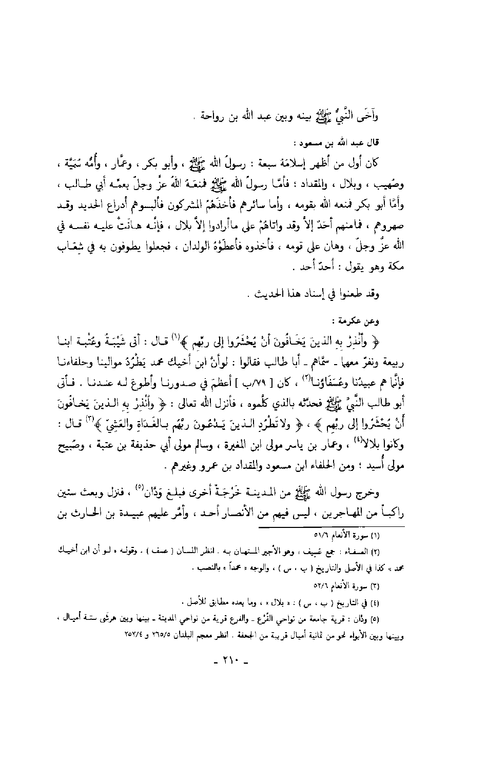 وعن عكرمة: " وأنذر به الذين يخافون أن يحشروا إلى ربهم " قال: أتى شيبة وعتبة ابنا ربيعة ونفر معهما - سماهم - أبا طالب فقالوا: لو أن ابن أخيك محمد يطرد موالينا وحلفاءنا فإنما هم عبيدنا وعسافءنا، كان أعظم في صدورنا وأطوع له عندنا. فأتى أبو طالب النبي صَلَّى اللهُ عَلَيْهِ وَسَلَّمَ فحدثه بالذي كلموه، فأنزر الله تعالى: " وأنذر به الذين يخافون أن يحشروا إلى ربهم "، " ولا تطرد الذين يدعون ربهم بالغادة والعشي " قال: وكانوا بلالاً، وعمار بن ياسر مولى ابن المغيرة، وسالم مولى أبي حذيفة بن عتبة، وصبيح مولى أسيد؛ ومن الحفلاء اين مسعود والمقداد بن عمرو وغيرهم.