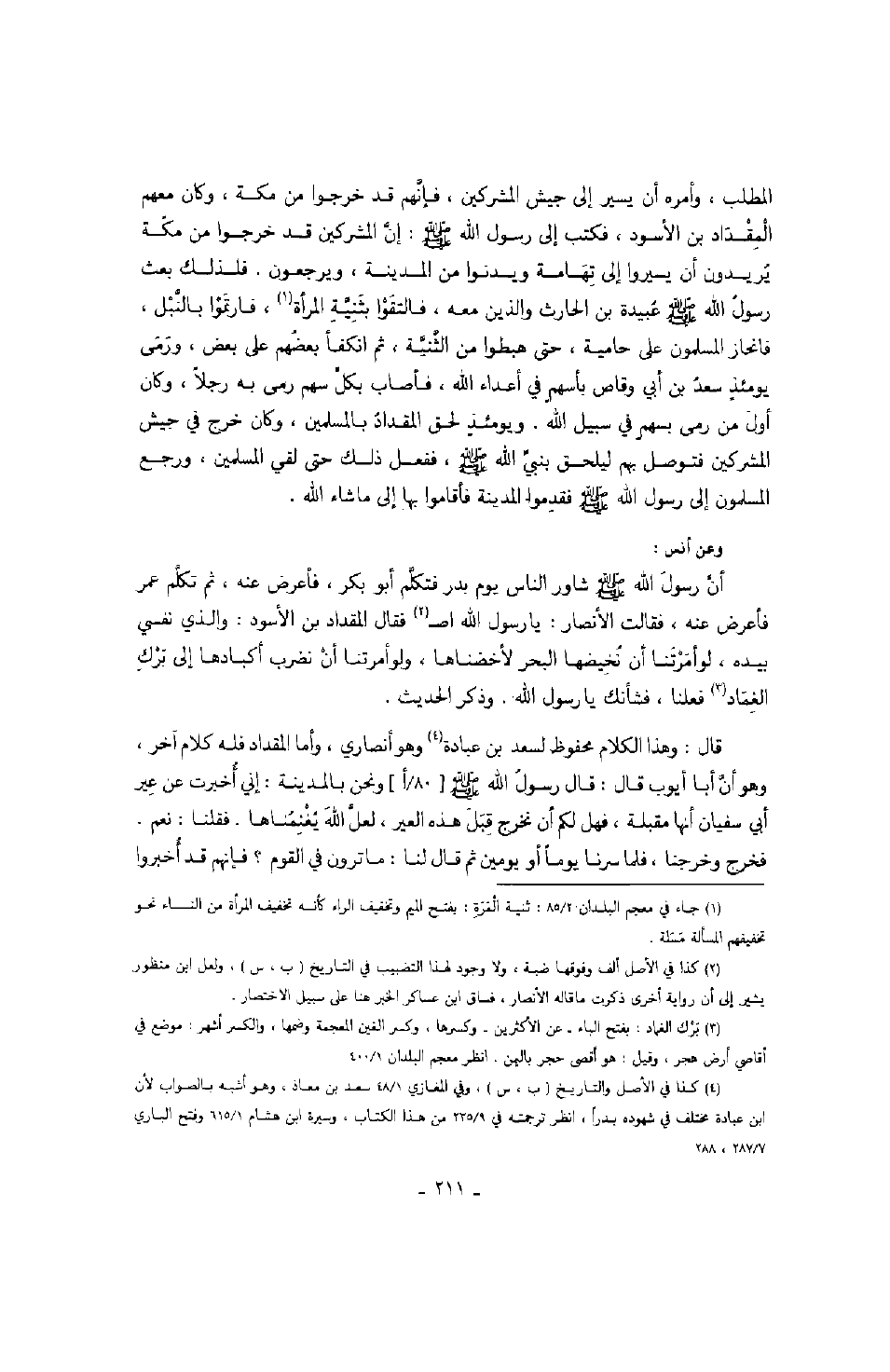 وعن أنس: أن رسول الله صَلَّى اللهُ عَلَيْهِ وَسَلَّمَ شاور الناس يوم بدر فتكلم أبو بكر، فأعرض عنه، ثم تكلم عمر فأعرض عنه، فقالت الأنصار: يا رسول الله أوص فقال المقداد بن الأسود: والذي نفسي بيده، لو أمرتنا أن نخيضها البحر لأخضناها، لو أمرتنا أن نضرب أكبادها إلى برك الغماد فعلنا، فشأنك يا رسول الله. وذكر الحديث.