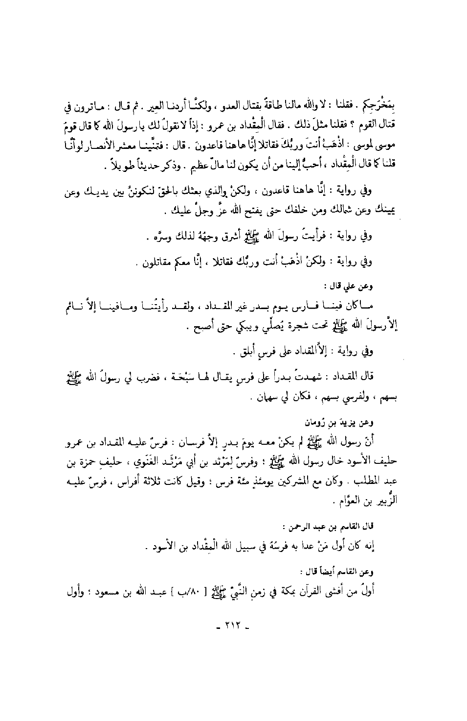 وعن علي بن قال: ما كان فينا فارس يوم بدر غير المقداد، ولقد أيتنا وما فينا إلا نائم إلا رسول رسول الله صَلَّى اللهُ عَلَيْهِ وَسَلَّمَ تحت شجرة يصلي ويبكي حتى أصبح.