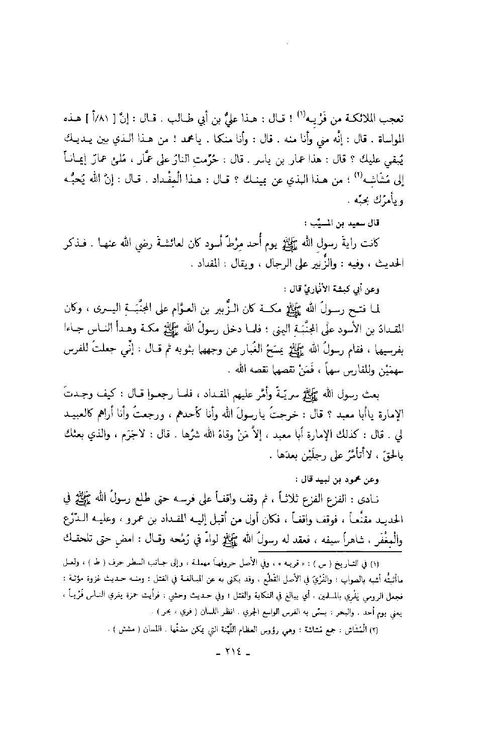 تعجب الملائكة من فريه! قال: هذا علي بن أبي طالب. قال: إن هذه المواساة. قال: إنه مني وأنا منه. قال: وأنا منكما. يا محمد! من هذا الذي بين يديك يبقي عليك؟ قال: هذا عمار بن ياسر. قال: حرمت النار على عمار، ملئ عمار إيماناً إلى مشاشه؛ من هذا الذي عن يمينك؟ قال: هذا المقداد. قال: إن الله يحبه ويأمرك بحبه.