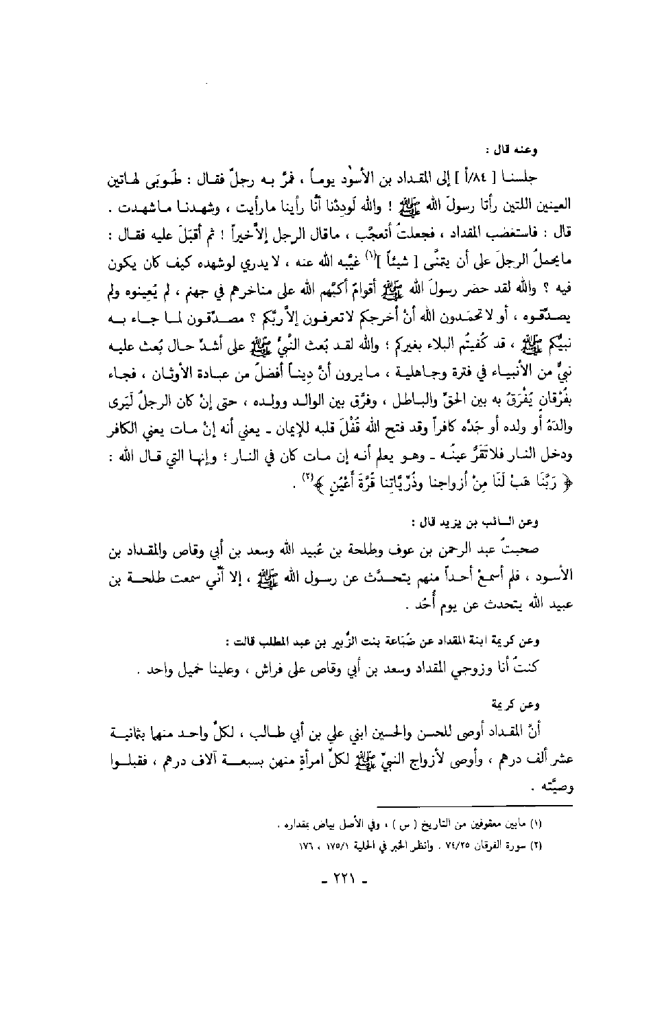 وعنه قال: جلسنا إلى المقداد بن السود يوماً، فمر به رجل فقال: طوبى لهاتين العينين اللتين رأتا رسول اله صَلَّى اللهُ عَلَيْهِ وَسَلَّمَ! والله لوددنا أنا رأينا ما رأيت، وشهدنا ما شهدت. قال: فاستغضب المقداد، فجعلت أتعجب، ما قال الرجل إلا خيراً! ثم أقبل عليه فقال: ما يحمل الرجل على أن يتمنى شيئاً غيبه الله عنه، لا يدري لو شهده كيف كان يكون فيه؟ والله لقد حضر رسول الله حروف أقوام أكبهم الله على من أخرهم في جهنم، لم يعينوه ولم يصدقوه، أو لا تحمدون الله أن أخرجكم لا تعرفون إلا ربكم؟ مصدقون لما جاء به نبيكم صَلَّى اللهُ عَلَيْهِ وَسَلَّمَ قد كفيتم البلاء بغيركم؛ والله لقد بعث النبي صَلَّى اللهُ عَلَيْهِ وَسَلَّمَ على أشد حال بعث عليه نبي من الأنبياء في فترة وجاهلية، ما يرون أن ديناً أفضل من عبادة الأوثان، فجاء بفرقان يفرق به بين الحق والباطل، وفرق بين الوالد وولده، حتى إن كان أرجل ليرى والده أو ولده أو جده كافراً وقد فتح الله قفل قلبه الوالد وولده، حتى إن كان الرجل ليرى والده أو ولده أو جده كافراً وقد فتح الله قفل قلبه لإيمان - يعني أنه إن ما يعني الكافر ودخل النار فلا تقر عينه - وهو يعلم أنه مات كان في النار؛ وإنها التي قال الله: " ربنا هب لنا من أزواجنا وذرياتنا قرة أعين ".