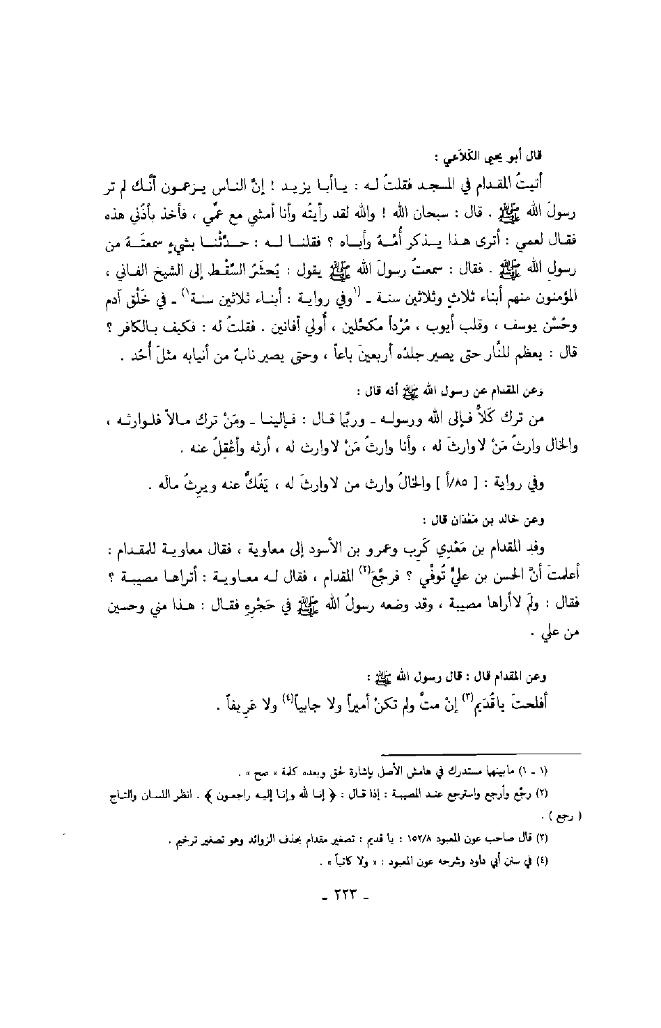 وعن المقدام عن رسول الله صَلَّى اللهُ عَلَيْهِ وَسَلَّمَ أنه قال:
