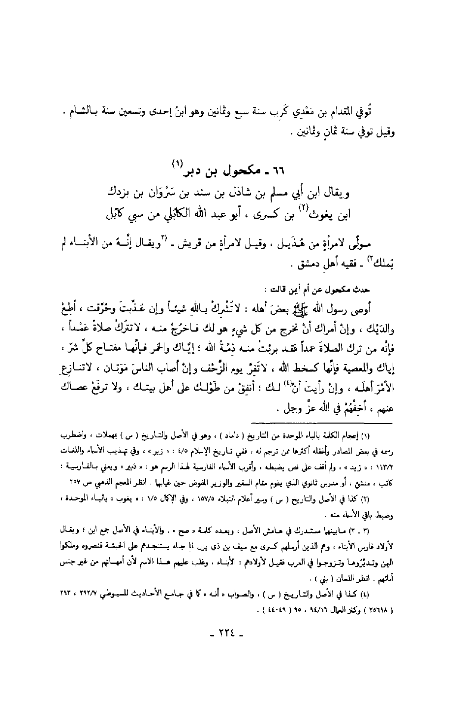 حدث مكحول عن أم أيمن قالت: أوصى رسول الله صَلَّى اللهُ عَلَيْهِ وَسَلَّمَ بعض أهله: لا تشرك بالله شيئاً وإن عذبت وحرقت، أطع والديك، وإن أمراك أن تخرج من كل شيء هو لك فاخرج منه، لا تترك صلاة عمداً، فإنه من ترك الصلاة عمداً فقد برئت منه ذمه الله؛ إياك والخمر فإنها مفتاح كل شر، إياك والمعصية فإنها كسخط الله، لا تفر يوم الزحف وإن أصاب الناس موتان، لا تنازع الأمر أهله، وإن رأيت أن لك؛ أنفق من طولك على أهل بيتك، ولا ترفع عصاك عنهم، أخفهم في الله عز وجل.