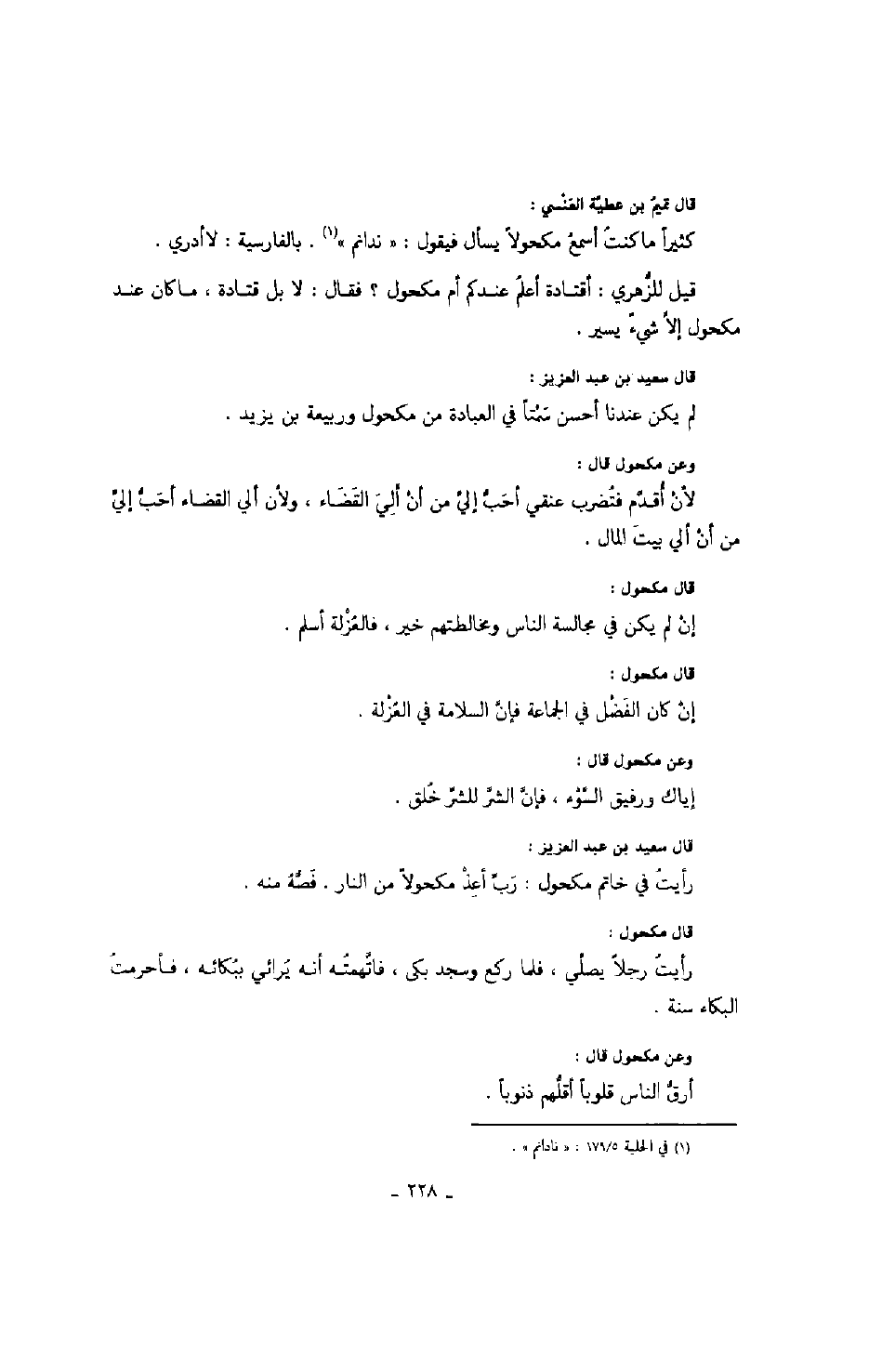 قال تميم بن عطية الهنسي: كثيراً ما كنت أسمع مكحولاً يسأل فيقول: ندانم. بالفارسية: لا أدري.