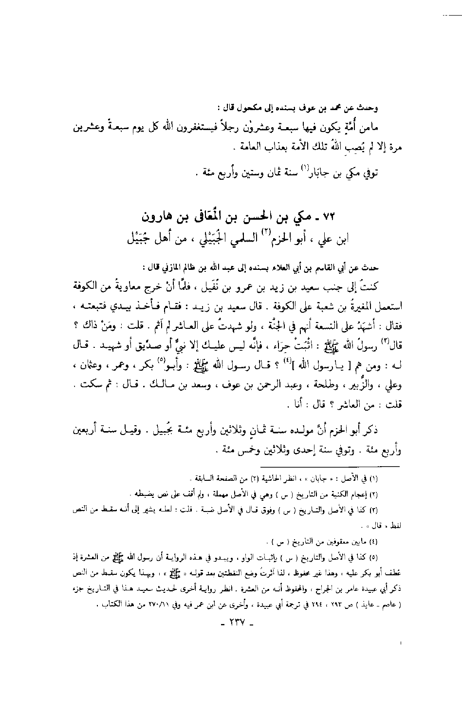 ابن هارون بن علي، أبو الحزم السلمي الجبيلي، من أهل جبيل حدث عن أبي القاسم بن أبي العلاء بسنده إلى عبد الله بن ظالم المازني قال: كنت إلى جنب سعيد بن زيد بن عمرو بن نفيل، فلما أن خرج معاوية من الكوفة استعمل المغيرة بن شعبة على الكوفة. قال عسيد بن زيد: فقام فأخذ بيده فتبعته، فقال: أشهد على التسعة أنهم في الجنة، ولو شهدت على العاشر لم آثم. قلت: ومنذاك؟ قال رسول الله صَلَّى اللهُ عَلَيْهِ وَسَلَّمَ: أثبت جراء، فإنه ليس ليك إلا نبي أو صديق أو شعيد. قال له: ومن هم يا رسول الله؟ قال رسول الله صَلَّى اللهُ عَلَيْهِ وَسَلَّمَ: أبو بكر، وعمر، وعثمان، وعلي، والزبير، وطلحة، وعبد الرحمن بن عوف، وسعد بن مالك. قال: ثم سكت. قلت: من العاشر؟ قال: أنا.