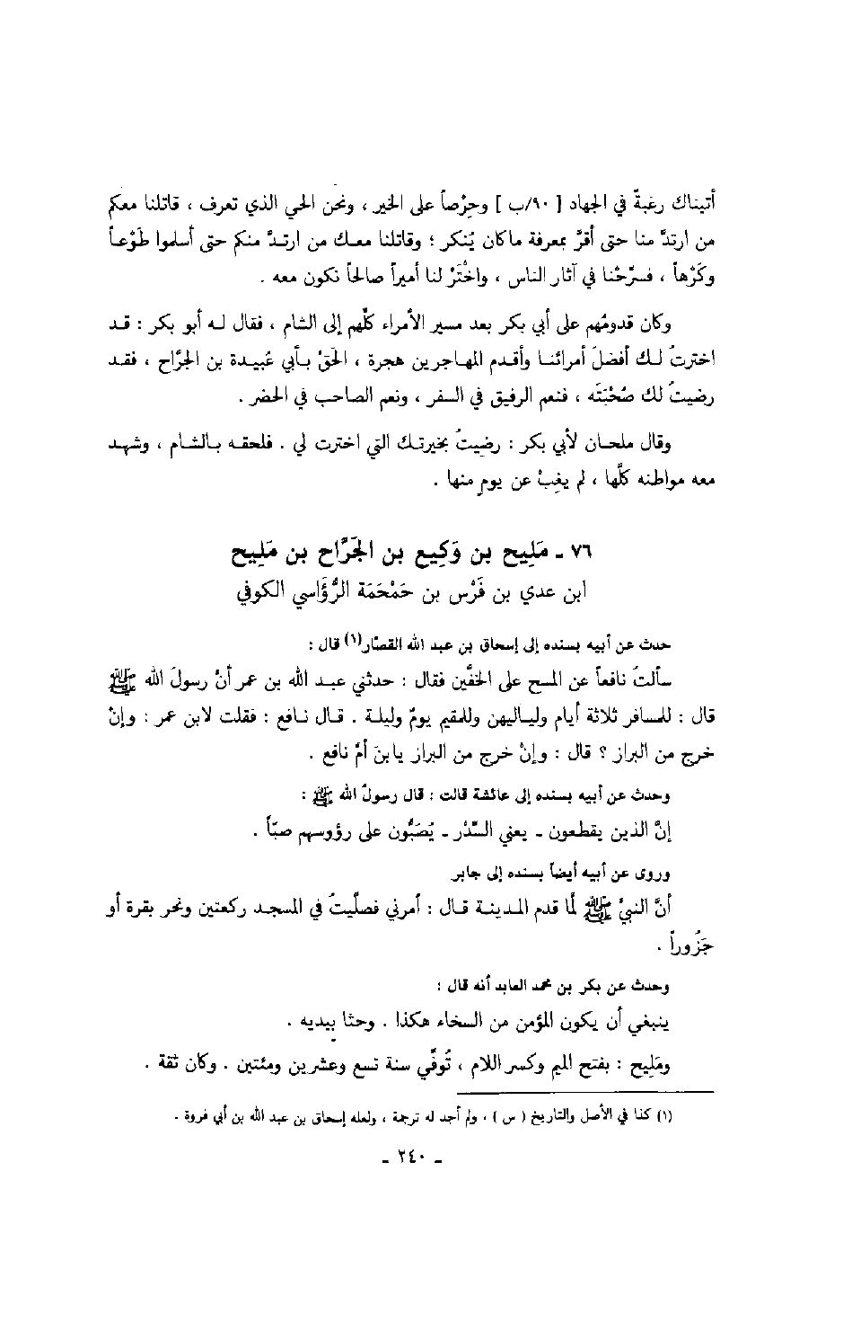 ابن مليح بن عدي بن فرس بن حمحمة الرؤاسي الكوفي حدث عن أبيه بسنده إلى إسحاق بن عبد الله القصار قال: سألت نافعاً عن المسح على الخفين فقال: حدثني عبد الله بن عمر أن رسول الله صَلَّى اللهُ عَلَيْهِ وَسَلَّمَ قال: للمسافر ثلاثة أيام ولياليهن وللمقيم يوم وليلة. قال نافع: فقلت لابن عمر: وإن خرج من البراز؟ قال: وإن خرج من البراز يا بن أم نافع.