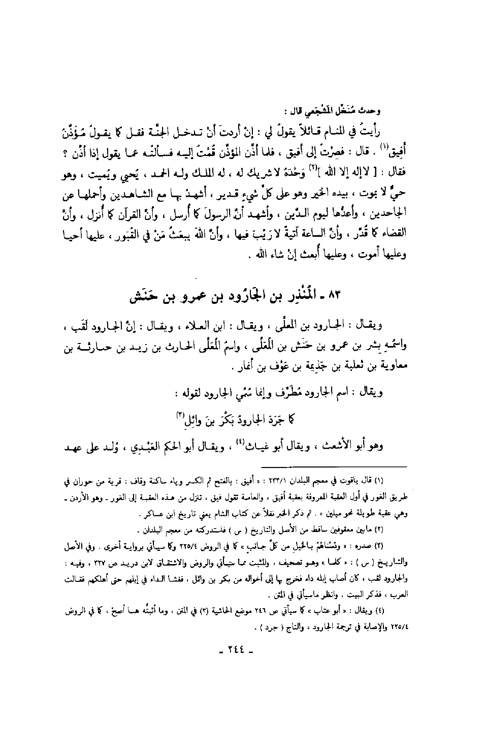 وحدث منخل المشجعي قال: رأيت في المنام قائلاً يقول لي: إن أردت أن تدخل الجنة فقل كما يقول مؤذن أفيق. قال: فصرت إلى أفيق، فلما أذن المؤذن قمت إليه فسألته عما يقول إذا أذن؟ فقال: لا إله إلا الله وحده لا شريك له، له الملك وله الحمد، يحيى ويميت، وهو حي لا يموت، بيده الخير وهو على كل شيء قدير، وأشهد بها مع الشاهدين وأحملها عن الجاحدين، وأعدها ليوم اليدن، وأشهد أن الرسول كما أرسل، وأو القرآن كما أنزل، وأن القضاء كما قدر، وأن الساعة آتية لا ريب فيها، وأن الله يبعث من في القبور، عليها أحيا وعليها أموت، وعليها أبعث إن شاء الله.