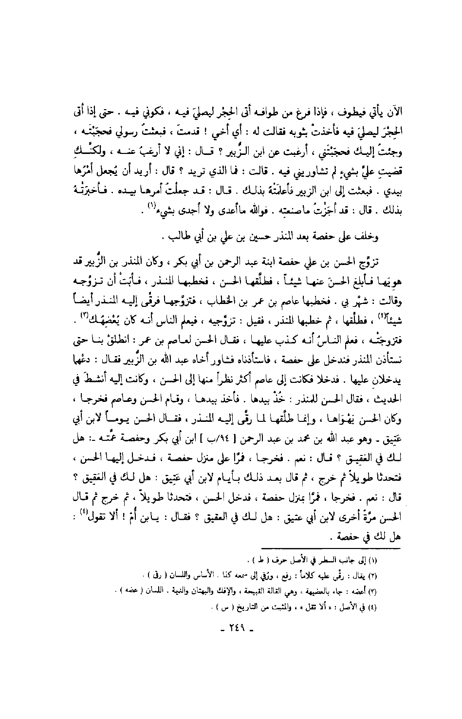 تزوج الحسن بن علي حفصة ابنة عبد الرحمن بن أبي بكر، وكان المنذر بن الزبير قد هو بها فأبلغ الحسن عنها شيئاً، فطلقها الحسن، فخطبها المنذر، فأبت أن تزوجه وقالت: شهر بي. فخطبها عاصم بن عمر بن الخطاب، فتزوجها فرقى إليه المنذر أيضاً شيئاً، فطلقها، ثم خطبها المنذر، فقيل: تزوجيه، فيعلم الناس أنه كان يعضهك. فتزوجته، فعلم الناس أنه كذب عليها، فقال الحسن لعاصم بن عمر: انطلق بنا حتى نستأذن المنذر فندخل على حفصة، فاستأذناه فشاور أخاه عبد الله بن الزبير فقال: دعهما يدخلان عليها. فدخلا فكانت إلى عاصم أكثر نظراً منها إلى الحسن، وكانت إليه أنشط في الحديث، فقال الحسن للمنذر: خذ بيدها. فأخذ بيدها، وقام الحسن وعاصم فخرجا، وكان الحسن يهواها، وإنما طلقها لما رقى إليه المنذر، فقال الحسن وعاصم فخرجا، وكان الحسن يهواها، وإنما طلقها لما رقي إليه المنذر، فقال الحسن يوماً لابن أبي عتيق - وهو عبد الله بن محمد بن عبد الرحمن ابن أبي بكر وحفصة عمته -: هل لك في العتيق؟ قال: نعم. فخرجا، فمرا على منزل حفصة، فدخل إليها الحسن، فتحدثا طويلاً ثم خرج، ثم قال بعد ذلك بأيام لابن أبي عتيق: هل لك في العتيق؟ قال: نعم. فخرجا، فمرا بمنزل حفصة، فدخل الحسن، فتحدثا طويلاً، ثم خرج ثم قال الحسن مرة أخرى لابن أبي عتيق: هل لك في العقيق؟ فقال: يابن أم! ألا تقول: هل لك في حفصة.
