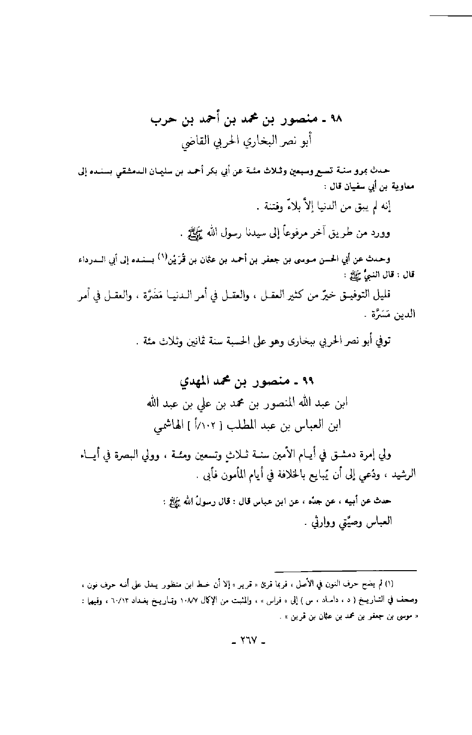 وحدث عن أبي الحسن موسى بن جعفر بن أحمد بن عثمان بن قرين بسنده إلى أبي الدرداء قال: قال النبي صَلَّى اللهُ عَلَيْهِ وَسَلَّمَ: قليل التوفيق خير من كثير العقل، والعقل في أمر الدنيا مضرة، والعقل في أمر الدين مسرة.