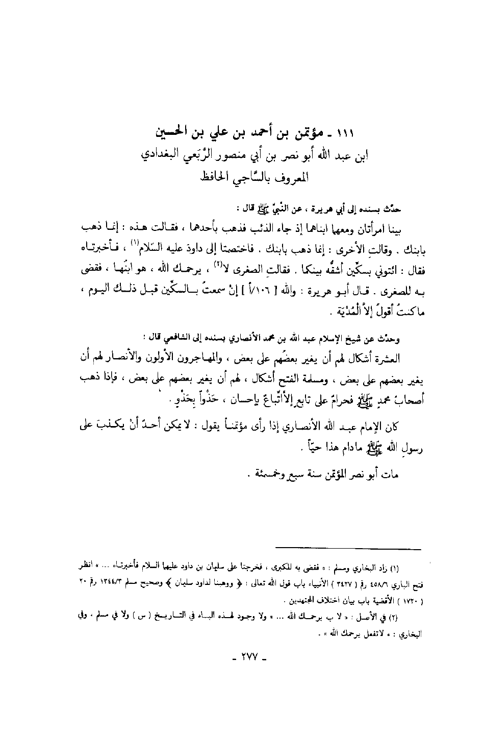 ابن الحسين بن عبد الله أبو نصر بن أبي منصور الربعي البغدادي المعروف بالساجي الحافظ حدث بسنده إلى أبى هريرة، عن النبي صَلَّى اللهُ عَلَيْهِ وَسَلَّمَ قال: بينا امرأتان ومعهما ابنهما إذ جاء الئب فذهب بأحدهما، فقالت هذه: إنما ذهب بابنك. وقالت الأخرى: إنما ذهب بابنك. فاختصمتا إلى داود عليه السلام، فأخبرتاه فقال: ائتوني بسكين أشقه بينكما. فقالت الصغرى لا، يرحمك الله، هو ابنها، فقضى به للصغرى. قال أبو هريرة: والله إن سمعت بالسكين قبل ذلك اليوم، ما كنت أقول إلا المدية.