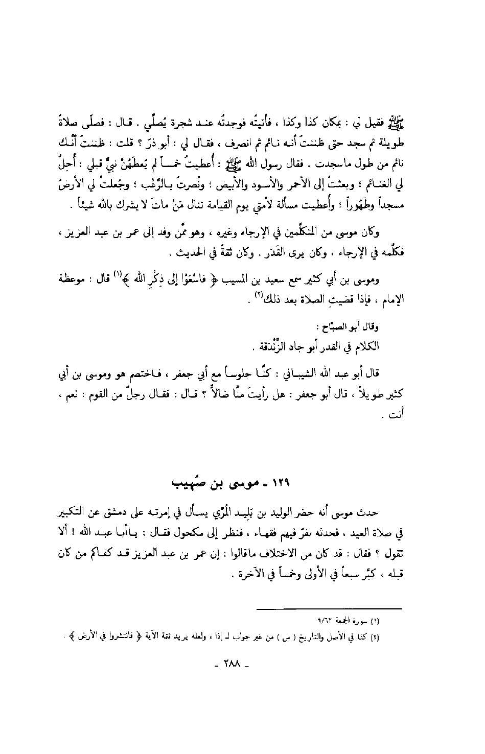 وكان موسى من المتكلمين في الإرجاء وغيره، وهو ممن وفد إلى عمر بن عبد العزيز، فكلمه في الإرجاء، وكان يرى القدر، وكان ثقة في الحديث.
