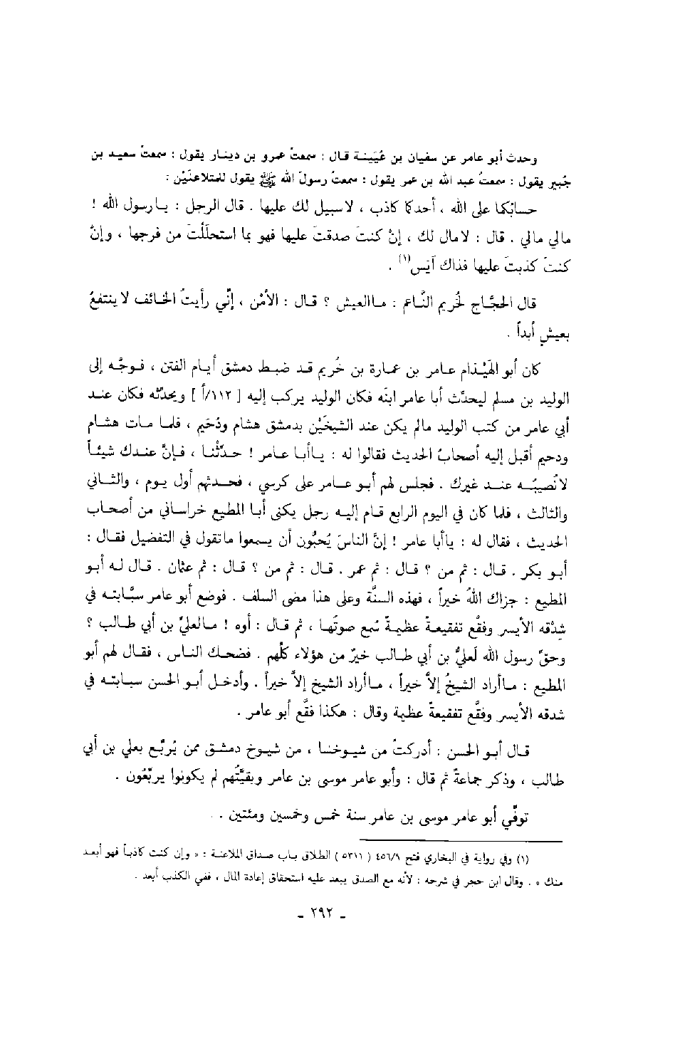 وحدث أبو عامر عن سفيان بن عيينة قال: سمعت عمرو بن دينار يقول: يمعت سعيد بن جبير يقول: سمعت عبد الله بن عمر يقولك يمعت رسول الله صَلَّى اللهُ عَلَيْهِ وَسَلَّمَ يقول للمتلاعنين: حسابكما على الله، أحدكما كاذب، لا سبيل لك عليها. قال الرجل: يا رسول الله! مالي مالي. قال لا مال لك، إن كنت صدقت لعيها فهو بما استحللت من فرجها، وإن كنت كذبت عليها فذاك آيس.