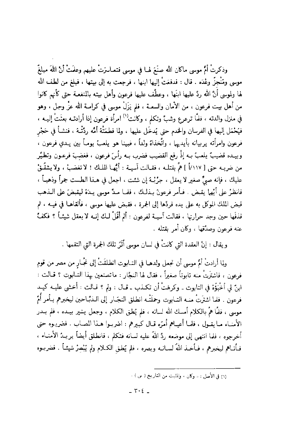 وذكرت أم موسى ما كان الله صنع لها في موسى فتعاسرت عليهم وعلمت أن الله مبلغ موسى ومنجز وعده. قال: فدفعت إليها ابنها، فرجعت به إلى بيتها، فبلغ من لطف الله لها ولموسى أن الله رد عليها ابنها، وعطف عليها فرعون وأهل بيته بالمنفعة حتى كأنهم كانوا من أهل بيت فرعون، من المان والسعة، فلم يزل موسى في كرامة الله عز وجل، وهو في منزل والدته، فلما ترعرع وشب وتكلم، وكانت امرأة فرعون إذا أرداته بعثت إليه، فيحمل إليها في الفرسان والخدم حتى يدخل عليها، ولما فطمته أمه ردته، فنشأ في حجر فرعون وامرأته يربيانه بأيديهما، واتخذاه ولداً، فبينا هو يلعب يوماً بين يدي فرعون، وبيده قضيب يلعب به إذ رفع القضيب فضرببه رأس فرعون، فغضب فرعون وتطير من ضربه حتى هم بقتله، فقالت آسية: أيها الملك! لا تغضب، ولا يشقق عليك، فإنه صبي صغير لا يعقل، جربه إن شئت، اجعل في هذا الطست جراً وذهباً، فانظر على أيهما يقبض، فأمر فرعون بذلك، فلما مد موسى يده ليقبض على الذهب قبض الملك الموكل به على يده فردها إلى الجمرة، فقبض عليها مويى، فألقاها في فيه، ثم قذفها حين وجد حرارتها، فقالت آسية لفرعون: أن أفل لك إنه لا يعقل شيئاً؟ فكف عنه فرعون وصدقها، وكان أمر بقتله.