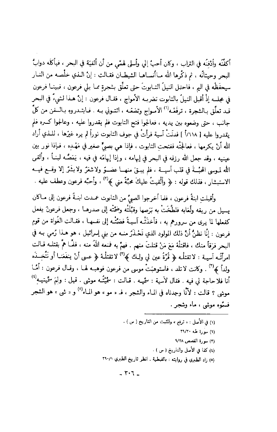 وأقبلت ابنة فرعون، فلما أخرجوا الصبي من التابوت عمدت ابنة فرعون إلى ما كان يسيل من ريقه ولعابه فلطخت به برصها وقبلته وضمته إلى صدرها، وجعل فرعون يفعل كفعلها لما يرى من سرورهم به، فأخذته آسية فضمته إلى نفسها، فقالت الغواة من قوم فرعون: إنا نظن أن ذلك المولود الذي تحذر منه من بني إسرائيل، هو هذا رمي به في البحر فرقاً منك، فاقتله مه من قتلت منهم. فهم به فمنعه الله منه، فلما هم بقتله قالت إمراته آسية: لا تقتله " قرة عين لي ولك " لا تقتله " عسى أن ينفعنا أو نتخذه ولداً " وكانت لا تلد، فاستوهبت موسى من فرعون فوهبه لها، وقال فرعون: أما أنا فلا حاجة لي فيه. فقالت لآسية: سميه. قالت سميته موشى. قيل: ولم سميته موشى؟ قالت لأنا وجدنا في الماء والشجر ف مه هو الماء وشى هو الشجر فسموه موشى، ماء وشجر.