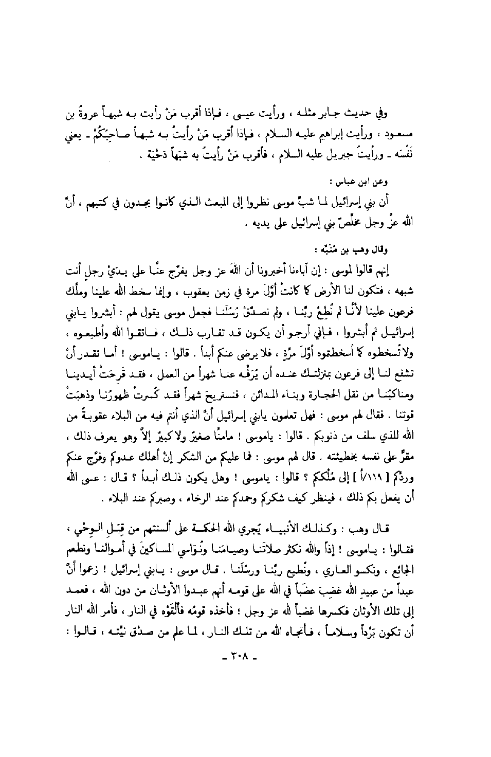 قال وهب: وكذلك الأنبياء يجري الله الحكمة على ألسنتهم من قبل الوحي، فقالوا: يا موسى! إذاً والله نكثر صلاتنا وصيامنا ونواسي المساكين في اموالنا ونظع الجائع، ونكسو العاري، ونطيع ربنا ورسلنا. قال موسى: يا بني إسرائيل! زعموا أن عبداً من عبيد الله غضباً عضباً في الله على قومه أنهم عبدوا الأوثان من دون الله، فعمد إلى تلك الأوثان فكسرها غضباً لله عز وجل؛ فأخذه قومه فالقوة في النار، فأمر الله النار أن تكون برداً وسلاماً، فأنجاه الله من تلك النار، لما علم من صدق نيته، قالوا: