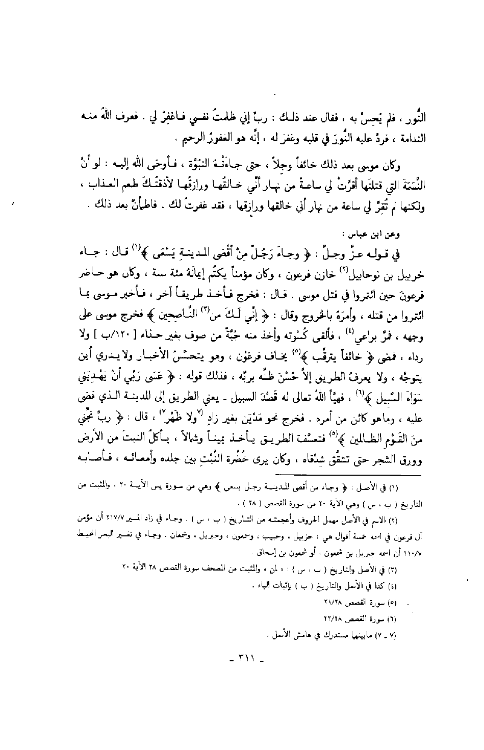 في قوله عز وجل: " وجاء رجل من أقصى المدينة يسعى " قال: جاء خربيل بن نوحابيل خازن فرعون، وكان مؤمناً يكتم إيمانه مئة سنة، وكان هو حاضر فرعون حين ائتمروا في قتل موسى. قال: فخرج فأخذ طريقاً آخر، فأخبر موسى بما ائتمروا من قتله، وأمره بالخروج وقال: " إني لك من الناصحين " فخرج موسى على وجهه، فمر براعي، فألقى كسوته واخذ منه جبة من صوف بغير حذاء ولا رداء، فمضى " خائفاً يترقب " يخاف فرعون، وهو يتحسس الأخبار ولا يدري أين يتوجه، ولا يعرف الطريق إلا حسن ظنه بربه، فذلك قوله: " عسى ربي أن يهديني سواء السبيل " فهيأ الله تعالى له قصد السبيل - يعني الطريق إلى المدينة الذي قضى عليه، وما هو كائن من أمره. فخرج نحو مدين بغير زاد ولا ظهر، قال: " رب نجني من القوم الظالمين " فتعسف الطريق يأخذ يميمناً وشمالاً، يأكل النبت من الأرض وورق الشجر حتى تشقق شدقاه، وكان يرى خضرة النبت بين جلده وأمعائه، فأصابه