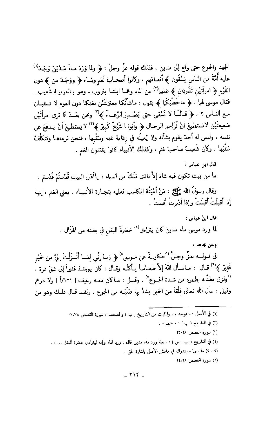 الجهد والجوع حتى وقع إلى مدين، فذلك قوله عز وجل: " ولما ورد ماء مدين وجد عليه أمة من الناس يسقون " أنعامهم، وكانوا أصحاب نعم وشاء " ووجد من " دون القوم " امرأتين تذوادان " غنمها عن الماء وهما ابنتا يثروب - وهو بالعربية شعيب - فقال موسى لهما: " ما خطبكما " يقول: ما شأنكما معتزلتين بغنمكما دون القوم لا تسقيان مع الناس؟. " قالتا لا نسقي حتى يصدر الرعاء " ونحن بعد كما ترى إمراتين ضعيفتين لا نستطيع أن نزاحم الرجال " وأبونا شيخ كبير " لا يستطيع أن يدفع عن نفسه، وليس أحد يقوم بشأنه ولا يعنيه في رعاية غنمه وسقيها، فنحن نرعاها ونتكلف سقيها، وكان شعيب صاحب غنم، وكذلك الأنبياء كانوا يقتنون الغنم.