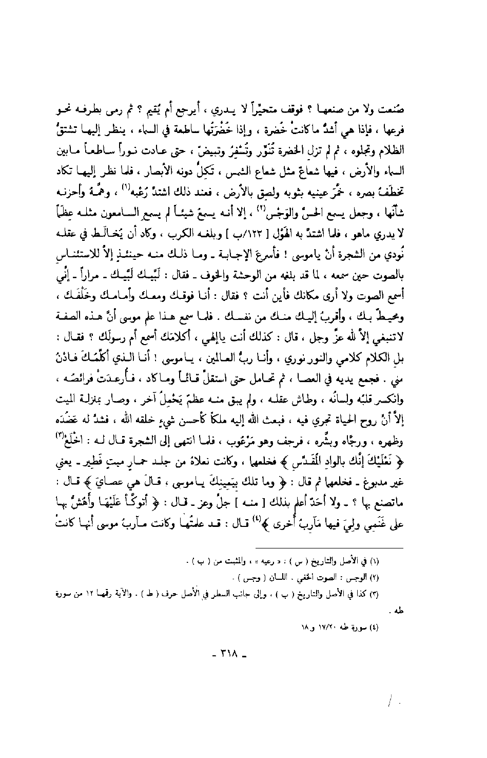 صنعت ولا من صنعها؟ فوقف متحيراً لا يدري، أيرجع أم يقيم؟ ثم رمى بطرفه نحو فرعها، فإذا هي أشد ما كانت خضرة، وإذا خضرتها ساطعة في السماء، ينظر إليها تشتق الظلام وتجلوه، ثم لم تزل الخضرة تنور وتسفر وتبيض، حتى عاد نوراً ساطعاً ما بين السماء والأرض، فيها شعاع الشمس، تكل دونه الأبصار، فلما نظر إليها تكاد تخطف بصره، خمر عينيه بثوبه ولصق بالأرض، فعند ذلك اشتد رعبه، وهمه وأحزنه شأنها، وجعل يسمع الحس والوجس، إلا أنه يسمع شيئاً لم يسمع السامعون مثله عظماً لا يدري ما هو، فلما اشتد به الخول وبلغه الكرب، وكاد أن يخالط في عقله نودي من السجرة أن يا موسى! فأسرع الإجابة - وما ذلك منه حينئذ إلا للاستئناس بالصوت حين سمعه، لما قد بلغه من الوحشة والخوف - فقال: لبيك لبيك - مراراً - إني أسمع الصوت ولا أرى مكانك فأين أنت؟ فقال: أنا فوقك ومعك وأمامك وخلفك، ومحيط بك، وأقرب إليك منك من نفسك. فلما سمع هذا علم موسى أن هذه الصفة لا تنبغي إلا لله عز وجل، قال: كذلك أنت يا إلهي، أكلامك أسمع أم رسولك؟ فقال: بل الكلام كلامي والنور نوري، وأنا رب العالمين، يا موسى! أنا الذي أكلمك فأذن مني. فجمع يديه في العصا، ثم تحامل حتى استقل قائماً وما كاد، فأرعدت فرائصه، وانكسر قلبه ولسانه، وطاش عقله، ولم يبق منه عظم يحمل آخر، وصار بمنزلة الميت إلا أن روح الحياة تجري فيه، فبعث الله إليه ملكاً كأحسن شيء خلقه الله، فشد له عضده وظهره، ورجاه وبشره، فرجف وهو مرعوب، فلما انتهى إلى الشجرة قال له: اخلع " نعليك إنك بالواد المقدس " فخلعهما، وكانت نعلاه من جلد حمار ميت فطير - يعني غير مدبوغ - فخلعهما ثم قال: " وما تلك بيمينك يا موسى، قال هي عصاي " قال: ما تصنع بها؟ - ولا أحد أعلم بذلك منه جل وعز - قال: " أوتكأ عليها وأهش بها على غنمي ولي فيها مآرب أخرى " قال: قد علمتها وكانت مآرب موسى أنها كانت