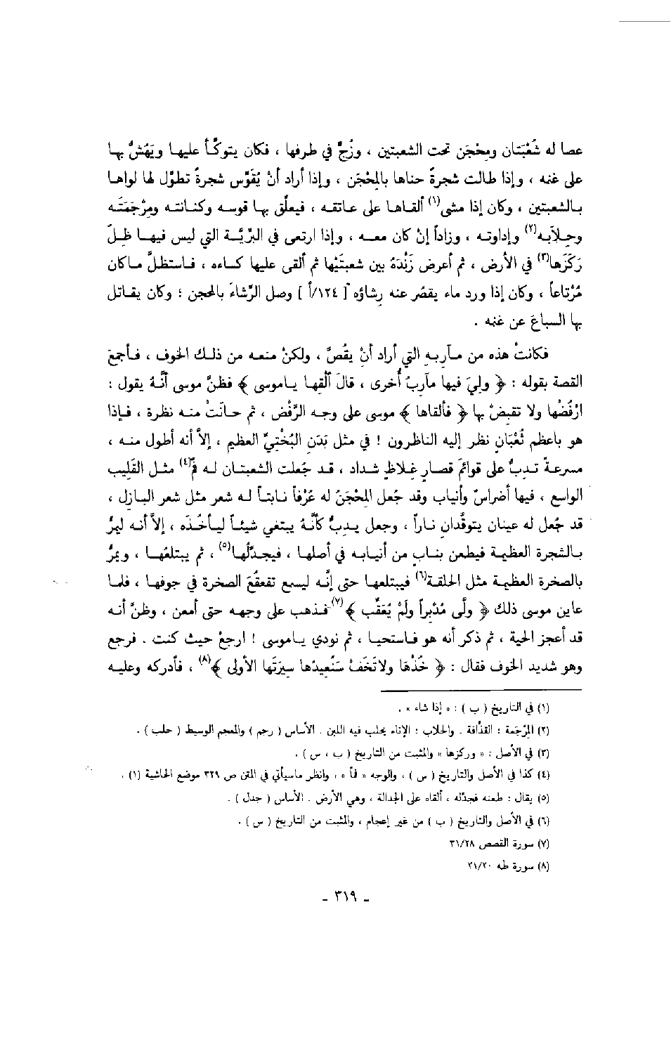 فكانت هذه من مآربه التي أراد أن يقص، ولكن منعه من ذلك الخوف، فأجمع القصة بقوله: " ولي فيها مآرب أخرة، قال ألقها يا موسى " فظن موسى أنه يقول ارفضها ولا تقبض بها " فألقاها موسى على وجه الرفض، ثم حانت منه نظرة، فإذا هو بأعظم ثعبان نظر إليه الناظرون! في مثل بدن البختي العظيم، إلا أنه أطول منه، مسرعة تدب على قوائم قصار غلاظ شداد، قد جعلت الشعبتان له فم مثل القليب الواسع، فيها أضراس وأنياب وقد جعل له عرفاً نابتاً له شعر مثل شعر البازل، قد جعل له عينان يتوقدان ناراً، وجعل يدب كأنه يبتغي شيئاً ليأخذه، إلا أنه ليمر بالشجرة العظيمة فيطعن بناب من أنيابه في أصلها، فيجدلها، ثم يبتلعها، ويمر بالصخرة العظيمة مثل الحلقة فيبتلعها حتى أنه ليسمع تقعقع الصخرة في جوفها، فلما عاين موسى ذلك " ولى مدبراً ولم يعقب " فذهب على وجهه حتى أمعن، وظن أنه قد أعجز الحية، ثم ذكر أنه هو فاستحيا، ثم نودي يا موسى! ارجع حيث كنت. فرجع وهو شديد الخوف فقال: " خذها ولا تخف سنعيدها سيرتها الأولى "، فأدركه وعليه