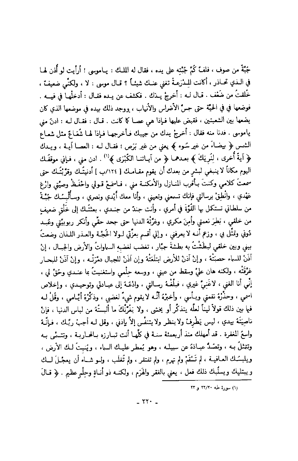 جبة من صوف، فلف كم جبته على يده، فقال له الملك: يا موسى! أرأيت لو أذن لها في الذي تحاذر، أكانت المدرعة تغني عنك شيئاً؟ قال موسى: لا، ولكني ضعيف، خلقت من ضعف، قال له: أخرج يدك، فكشف عن يده فقال: أدخلها في فيه. فوضهعا في في الحية حتى حبس الأضراس والأنياب، ووجد ذلك بيده في موضعها الذي كان يضعها بين الشعبتين، فقبض عليها فإذا هي هصا كما كانت، قال: فال له: ادن منس سا موسى، فدنا منه فقال: أخرج يدك من جيبك فأخرجها فإذا الشعاع مثل شعاع الشمس " بيضاء من غير سوء " يعني من غير برص؛ فقال له: العصا آية، ويدك " آية أخرى، لنريك " بعدهما " من آياتنا الكبرى ". ادن مني، فإني موقفك اليوم مكاناً لا ينبغي لبش من بعدك أن يقوم مقامك أدنيتك وقربتك حتى سمعت كلامي وكنت بأقرب المنازل والأمكنة منين فاسمع قولي واحفظ وصيتي وارع عهدي، وانطلق برسالتي فإنك تسمعني وتعيني، وأنا معك أيدي ونصري، وسألبسك جبة من سلطاني تستكمل بها القوة في أمري، وأنت جند من جندي، بعثتك إلى خلق ضعيف من خلقي، بطر نعمتي وأمن مكري، وغرته الدنيا حتى جحد حقي وأنكر ربوبيتي وعبد دوني وتمثل بي، وزعم أنه لا يعرفني، وإني أقسم بعزتي لولا الحجة العذر اللذان وضعت بيني وبين خلقي لبطشت به بطشة جبار، تغضب لغضبه السماوات والرض والجبال، إن آذن للسماء حصبته، وإن آذن للأرض ابتلعته وإن آذن للجبال درمته، وإن آذن للبحار غرقته، ولكنه هان علي وسقط من عيني، ووسعه حلمي واستغنت بما عندي وحق ي، إني أنا الغني، غنى غيري، فبلغه رسالتي، وادعه إلى عبادتي وتوحيدي، وإخلاص اسمي، وحذره نقمتي وبأسي، وأخبره أنه لا يقوم شيء لغضبي، وذكره أيامي، وقل له فيما بين ذلك قولاً ليناً لعله يتذكر أن يهشى، ولا يغرنك ما ألبسته من لباس الدنيا، فإن ناصيته بيدي، ليس يطرف ولا ينظر ولا يتنفس إلا يإذني، وقل له أجب ربك، فإنه واسع المغفرة، قد أمهلك منذ أرعبمئة سنة في كلها أنت تبارزه بالمحاربة، وتتسمى به وتتمثل به، وتصد عباده عن سبيله، وهو يمطر عليك السماء، وينبت لك الأرض، ويلبسك العافية، لم تسقم ولم تهرم، ولم تفتقر، ولم تغلب، ولو شاء أن يعجل لك ويبتليك ويسلبك ذلك فعل، يعني بالفقر والهرم، ولكنه ذو أناة وحلم عظيم. " قال