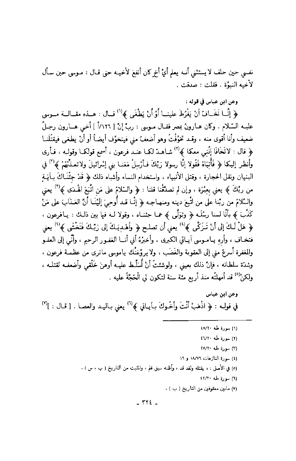 " إنا نخاف أن يفرط علينا أو أن يطغى " قال: هذه مقالة موسى عليه السلام. وكان هارون بمصر فقال موسى: رب إن أخي هارون رجل ضعيف وأنا أقوى منه، وقد تخوفت وهو أضعف مني فيتخوف أيضاً أو أن يطغى فيقتلنا " قال: لا تخافا إنني معكما " شاهد لكما عند فرعون، أسمع قولكما وقوله، فأرى وأنظر إليكما " فأتياه فقولا إنا رسولا ربك فأرسل معنا بني إسرائيل ولا تعذبهم " وفي البنيان ونقل الحجارة، وقتل الأنبياء، واستخدام النساء وأشباه ذلك " قد جئناك بآية من ربك " يعني بعبرة، إن لم تصدقنا قلنا: " والسلام على من اتبع الهدى " يعني والسلام من ربنا على من اتبع دينه ومنهاجه " إنا قد أوحي إلينا أن العذاب على من كذب " بأنا لسنا رسله " وتولى " عما جئناه، وقولا له فيما بين ذلك: يا فرعون، " هل لك إلى أن تزكى " يعني أن تصلح " وأهديك إلى ربك فتخشى " يعني فتخاف، وأره يا موسى آياتي الكبرى، وأخبر أني أنا الغفور الرحيم، وأني إلى العفو والمغفرة أسرع مني إلى العقوبة والغضب، ولا يروعنك يا موسى ما ترى من عظمة فرعون، وشدة سلطانه، فإن ذلك بعيني، ولو شئت أن أسلط عليه أوهن خلقي وأضعفه لقتله، ولكن قد أمهلته منذ أربع مئة سنة لكتون لي الحجة عليه.