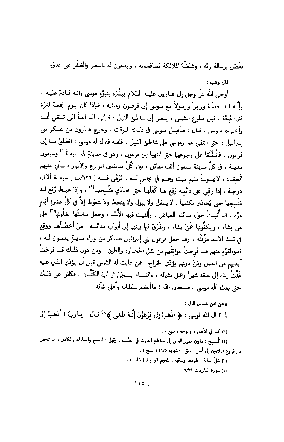 قال وهب: أوحى الله عز وجل إلى هارون عليه السلام يبشره بنبوة موسى وأنه قادم عليه، وأنه قد جعله وزيراً ورسولاً مع موسى إلى فرعون وملئه، فإذا كان يوم الجمعة لغرة ذي الحجة، قبل طلوع الشمس، ينظر إلى شاطئ النيل، فإنها السعة التي تلتقي أنت وأخوك موسى. قال: فأقبل موسى في ذلك الوقت، وخرج هارون من عسكر بني إسرائيل، حتى التقي هو وموسى على شاطئ النيل، فلقيه فقال له موسى: انطلق بنا إلى فرعون، فانطلقا على وجوههما حتى انتهيا إلى فرعون، وهو في مدينة لها سبعة وسبعون مدينة، في كل مدينة سبعون ألف مقاتل، بين كل مدينتين الزراع والأنهار، تأتي عليهم الحقب، لا يموت منهم ميت وهو في مجلس له، يرقى فيه سبعة آلاف درجة، إذا رقي على دابته رفع لها كفلها حتى يحاذي منسجها، وإذا هبط رفع له منسجها حتى يحاذى بكفلها، لا يسعل ولا يبول ولا يمتخط ولا يتغوط إلا في كل عشرة أيام مرة. قد أنبت حول مدائنة الغياض، وألقيت فيها الأسد، وجعل ساستها يشلونها على من يشاء، ويكفونها عمن يشاء، وطرق فيما بينهما إلى أبواب مدائنه، من أخطأها ووقع في تلك الأسد مزقته، وقد جعل فرعون بني إسرائيل عساكر من وراء مدينة يعملون له، فذو القوة منهم قد قرحت عواتقهم من نقل الحجارة والطين، ومن دون ذلك قد قرحت أيديهم من العمل ومن دونهم يؤدي الخراج؛ فمن غابت له الشمس قبل أن يؤدي الذي عليه غلت يده إلى عنقه شهراً وعمل بشماله، والنساء ينسجن ثياب الكتان، فكانوا على ذلك حتى بعث الله موسى، فسبحان الله ما أعظم سلطانه وأعلى شأنه وعن ابن عباس قال: لما قال الله لموسى: " اذهب إلى فرعون إنه طغى " قال: يا رب أذهب إلى
