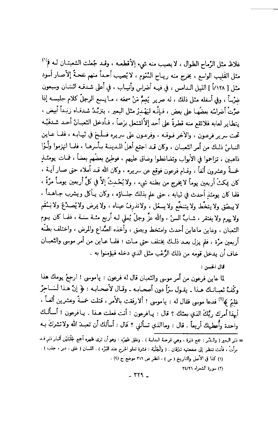 قال الحسن: لما عاين فرعون من أمر موسى والثعبان قال له فرعون: يا موسى! ارجع يومك هذا وكف ثعبانك هذا - يقول سراً دون أصحابه - وقال لأصحابه: " إن هذا لساحر عليم " فدعا موسى فقال له: يا موسى! ألا رفقت بالأمر، قتلت خمسى وعشرين ألفاً أبهذا أمرك ربك الذي بعثك؟ قال: يا فرعون! أنت فعلت هذا. يا فرعون! أسألك واحدة وأعطيتك أربعاً. قال: وما الذي تسألني؟ قال: أسألك أن تعبد الله ولا تشرك به