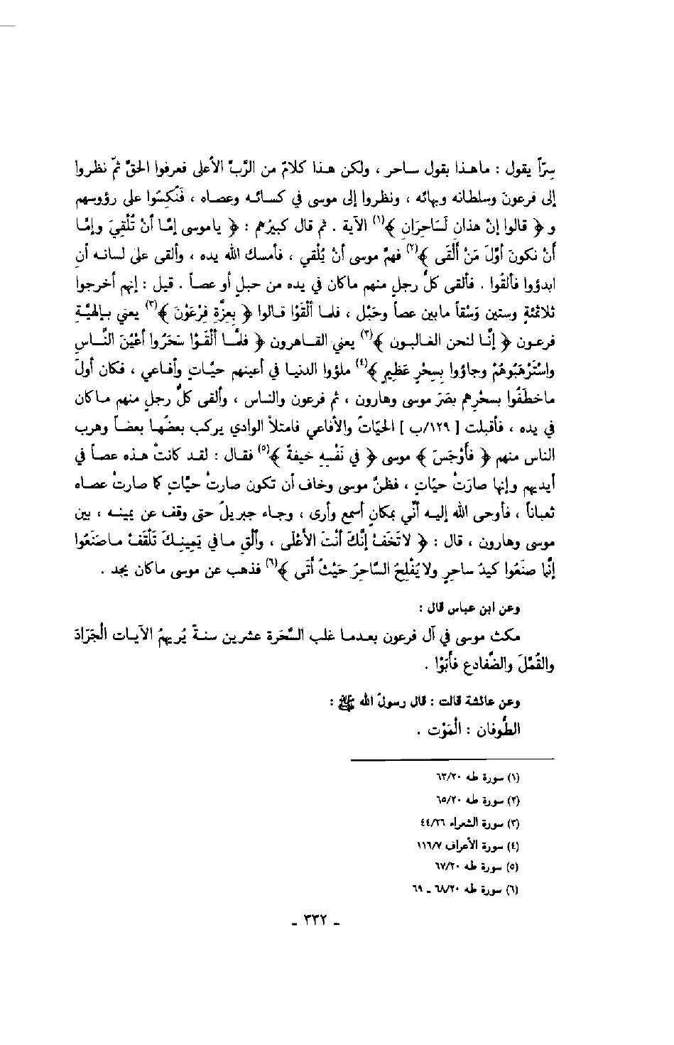 سراً يقول: ما هذا بقول ساحر، ولكن هذا كلام من الرب الأعلى فعرفوا الحق ثم نظروا إلى فرعون وسلطانه وبهائه، ونظروا إلى موسى في كشائه وعصاه، فنكسوا على رؤوسهم و" قالوا إن هذان لساحران " ألآية. ثم قال كبيرهم: " يا موسى إما أن تلقي وإما أن نكون أول من ألقى " فهم موسى أن يلقي، فأمسك الله يده، وألقى على لسانه أن ابدؤوا فألقوا. فألقى كل رجل منهم ما كان في يده من حبل أو عصاً. قيل: إنهم أخرجوا ثلاثمائة وستين وسقاً ما بين عصا وحبل، فلما ألقوا قالوا " بعزة فرعون " يعني بإلهية فرعون " إنا لنحن الغالبون " يعني القاهرون " فلما ألقوا سحروا أعين الناس واسترهبوهم وجاؤوا بسحر عظيم " ملؤوا الدنيا في أعينهم حيات وأفاعي، فكان أول ما خطفوا بسحرهم بصر موسى وهارون، ثم فرعون والناس، وألقى كل رجل منهم ما كان في يده، فأقبلت الحيات والأفاعي فامتلأ الوادي يركب بعضها بعضاً وهرب الناس منهم " فأوجس " موسى " في نفسه خيفة " فقال: لقد كانت هذه عصاً في أيديهم وإنها صارت حيات، فظن موسى وخاف أن تكون صارت حيات كما صارت عصاه ثعباناً، فأوحى الله إليه أني بمكان أسمع وأرى، وجاء جبريل حتى وقف عن يمينه، بين موسى وهارون، قال: " لا تخف إنك أنت الأعلى، وألق ما في يمينك تلقف ما صنعوا إنما صنعوا كيد ساحر ولا يفلح الساحر حيث أتى " فذهب عن موسى ما كان يجد.